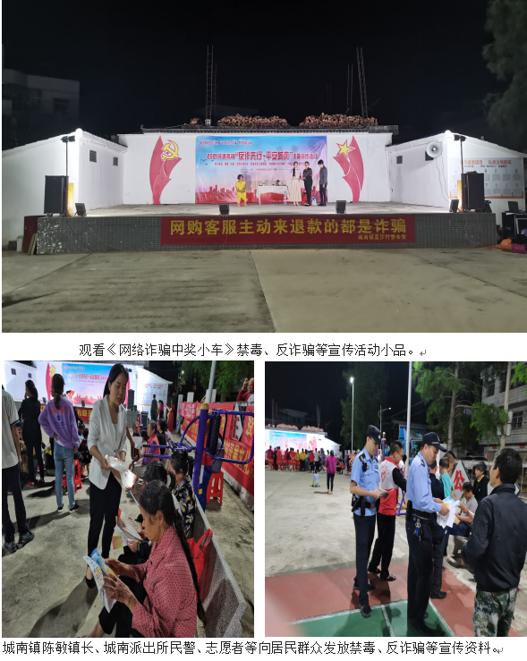 城南镇党委始终坚持以人民为中心的根本立场,主动担当作为,积极开展“我为群众办实事”系列实践活动。4月30日晚上,城南镇政府联合城南派出所、志愿者以禁毒、反电信诈骗宣传为切入点集中在城南镇皇沙村,开展了以“反诈先行·平安城南”主题宣传活动,进一步加强人民群众的禁毒、防诈骗意识。