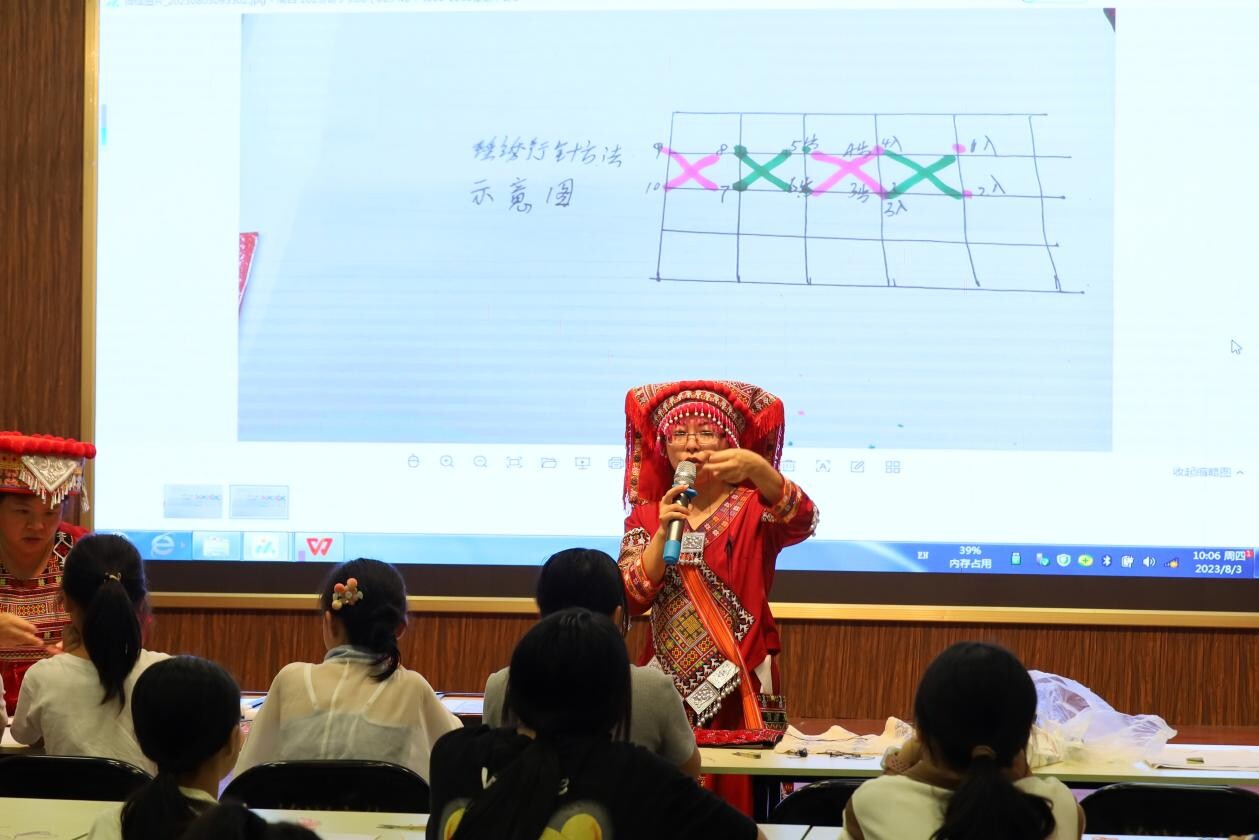 开班仪式结束后,瑶绣县级非遗代表性传承人邓雪英老师开始正式授课。邓雪英老师先向同学们介绍了瑶绣的历史渊源,加深同学们对于瑶绣的了解。之后,老师向同学们演示了瑶绣独特的穿针手法和用线方式,大大提升了同学们的刺绣效率。而后老师以图片讲解和上手教学相结合的方式教授瑶绣基础的行针方式。