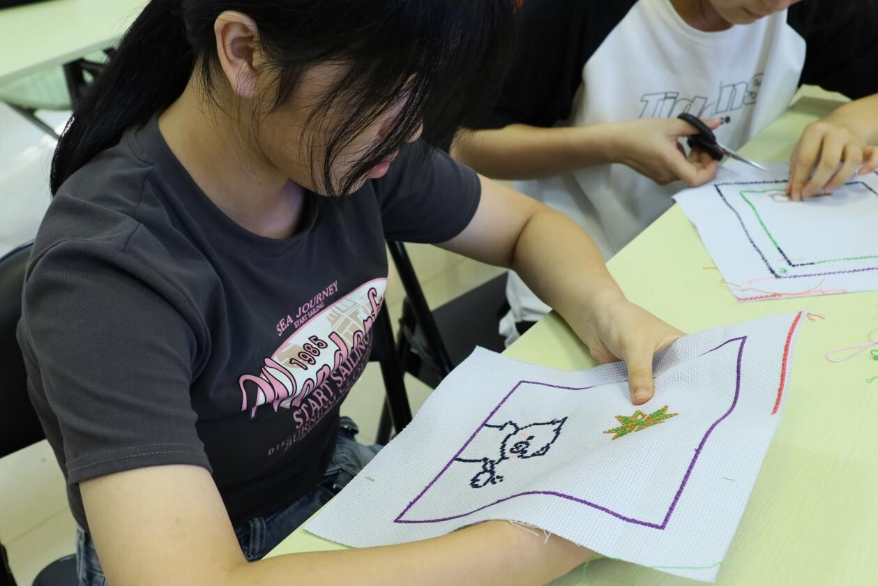 瑶绣的花纹样式和构图角度较为固定,用色鲜艳而古朴。下发刺绣工具后,同学们们纷纷选取自己喜爱的丝线颜色,开始着手刺绣。取线、穿针、下针、走针……同学们玩得不亦乐乎。