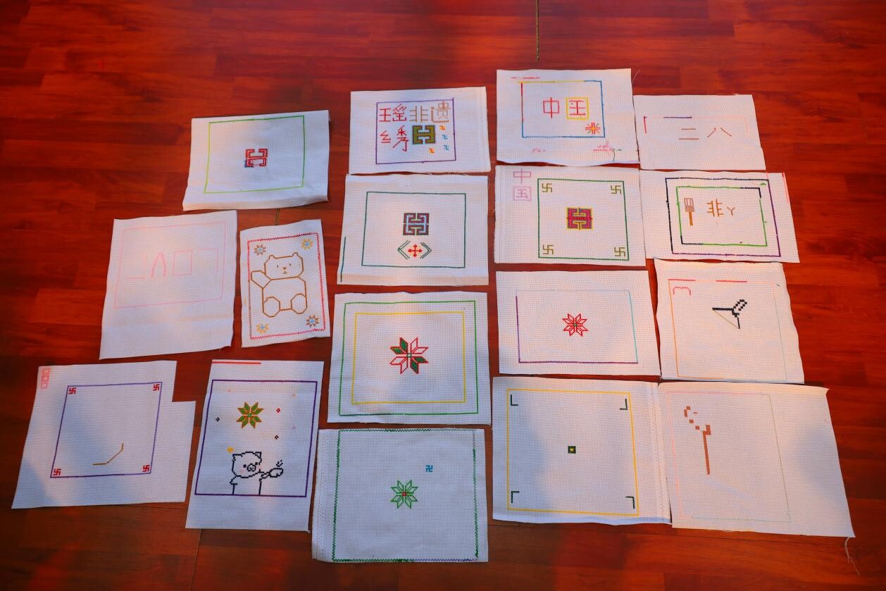 培训第二天,老师向学员们教授瑶绣中最具特色的图腾和花纹样式的绣法,即“卍”字纹和八角花。经过两天的培训,学员们已经熟练了方法,在老师的配色和构图指导下,很快就有一批学员绣出了瑶绣中的经典纹样。更有同学发挥自己的创造力和想象力,将可爱的小猪、熟悉的数字和汉字绣在了布上。传统瑶绣技法与现代元素的碰撞,让学员们的瑶绣作品显得童趣十足。