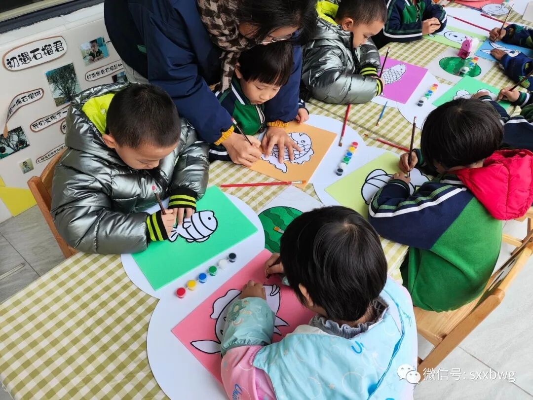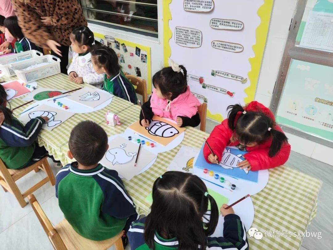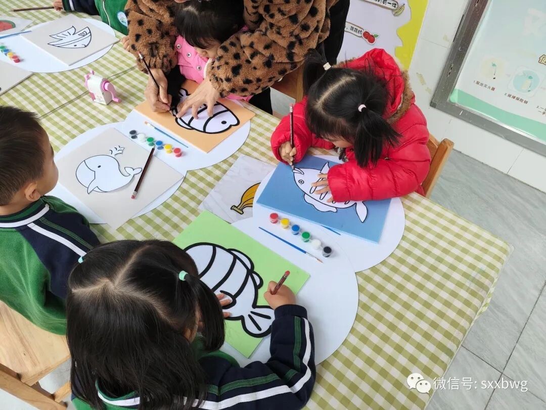 第三个活动是吹塑纸拓鱼活动,小朋友们利用工具,在吹塑纸上描摹出小鱼的形状,再用水彩颜料为自己制作的小鱼涂上喜欢的颜色。