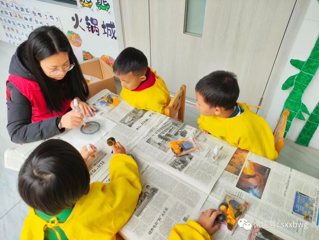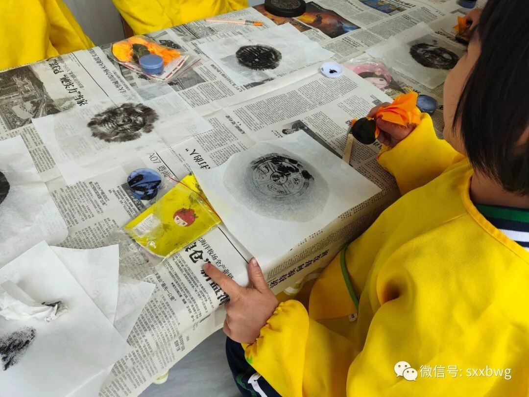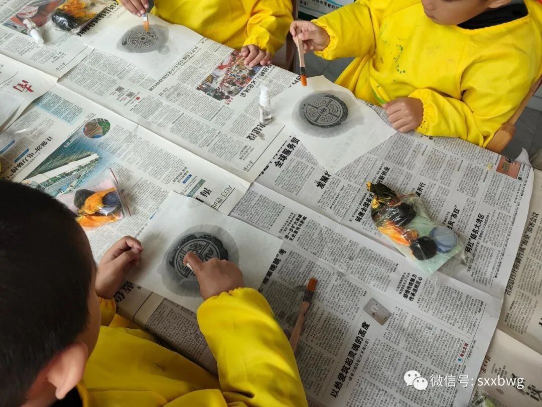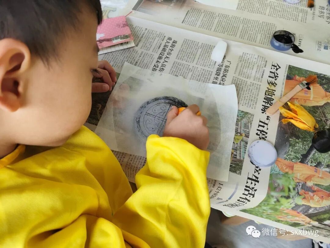 最后一个活动是非遗拓片,需要小朋友们先利用水、刷子和宣纸拓出瓦当上的图案,等宣纸干透后再利用布团蘸取墨水为图案上色,这个手工活动难度系数较大,十分考验小朋友们的耐心。