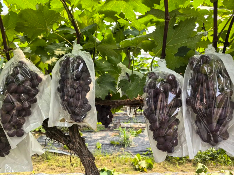 据了解,夏黑葡萄是巨峰葡萄与无核白葡萄杂交培育出的优良品种,完美融合了两者的优势。其果肉紧实硬脆又不失鲜嫩,果香层次丰富,最大的特点是无籽,且葡萄皮也能直接食用。成熟后的夏黑葡萄表皮愈发黑亮,果肉糖分充足,口感绝佳。此外,农场还种植了巨玫瑰、醉金香、阳光玫瑰等多个品种。眼下,工人们趁着晴好天气,忙着给巨玫瑰葡萄套袋,为它们穿上了一层“保护衣”。