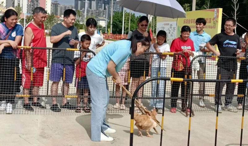活动现场,“小猪回家记”接力赛(第二场)率先鸣哨启动。参赛队员们手抱小猪,在赛道上默契接力、奋力比拼,围观群众的加油助威声此起彼伏,瞬间点燃了丰收竞技的欢乐氛围。除此之外,鸡鸭归巢、齐心协力把粮运等比赛也让大家在比拼中重温农事乐趣,传递出丰收时节的协作精神,现场笑声不断,尽显乡土气息与竞技活力。