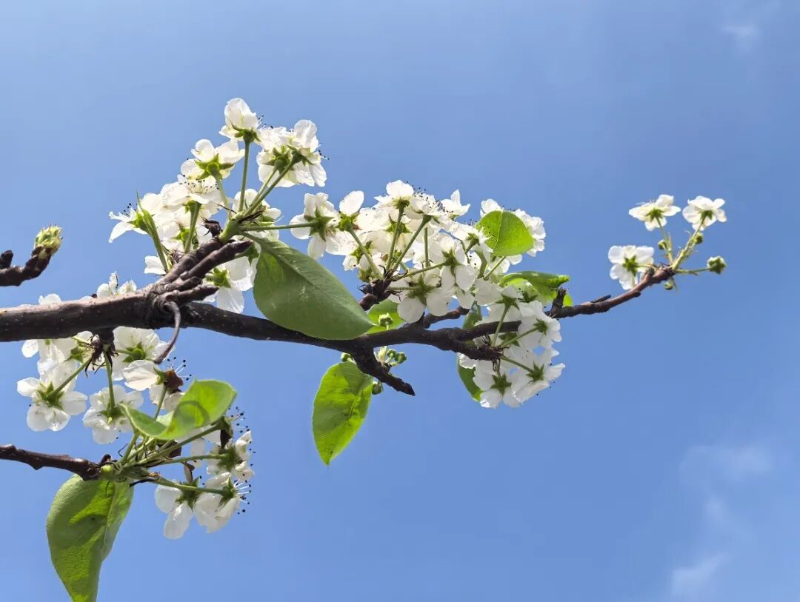 秋日田野满目金黄,几棵梨树却格外引人注目。洁白的梨花簇生于枝头,微风拂过轻轻摇曳,更令人称奇的是,同一枝条上,绽放的梨花旁还挂着一颗颗青绿色的小梨果,勤劳的蜜蜂也穿梭其间,在秋日梨花上忙着采蜜。春华秋实的自然规律被打破,季节的界限在此刻变得模糊。