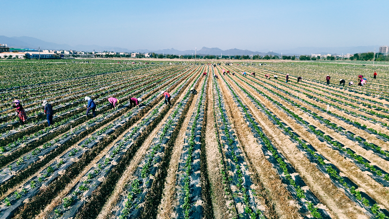 美青农业的蔬菜基地里,田垄整齐如织,满眼绿意盎然。从高空俯瞰,基地宛如一块巨大的拼图,不同种类的蔬菜田块有序排列,勾勒出规则的线条。虽已入冬,基地却一派忙碌:蚕豆地里,数十名工人弯腰清苗除草;西兰花田块,新栽的菜苗正扎根生长;而两个月前种下的豆苗、高脚菜心,已郁郁葱葱,进入丰产采收期。