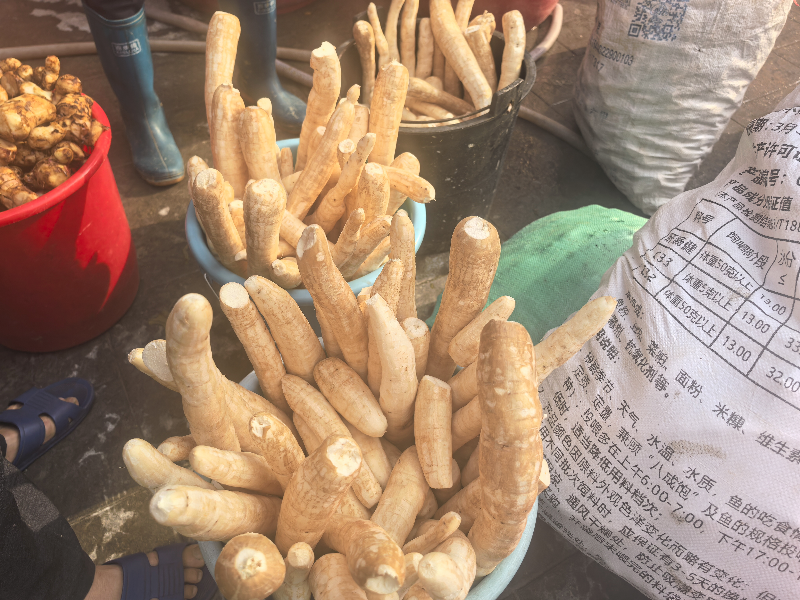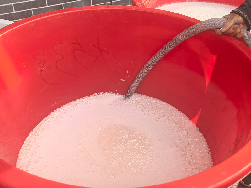 操作碾粉设备的阿姨动作麻利,抬手间便将一桶桶作物倒入研磨机,块茎瞬间被碾成碎渣,乳白色的浆液顺着设备流出,汇入一旁大桶,再加入清水搅拌均匀,静待后续沉淀。