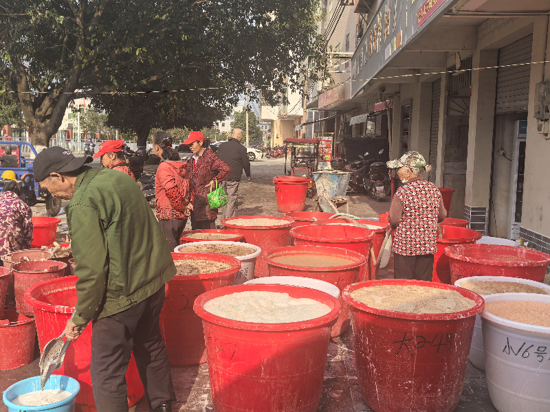在我县顿岗镇一处碾粉坊内,机器运转声不绝于耳,坊外空地上,数十个红色大桶整齐排列,格外醒目。农户们或挑担前行,或驾车而来,将洗净的番薯、魔芋,以及去皮后的木薯一一送来,在门口有序排队,等候碾制淀粉,一派繁忙景象。
