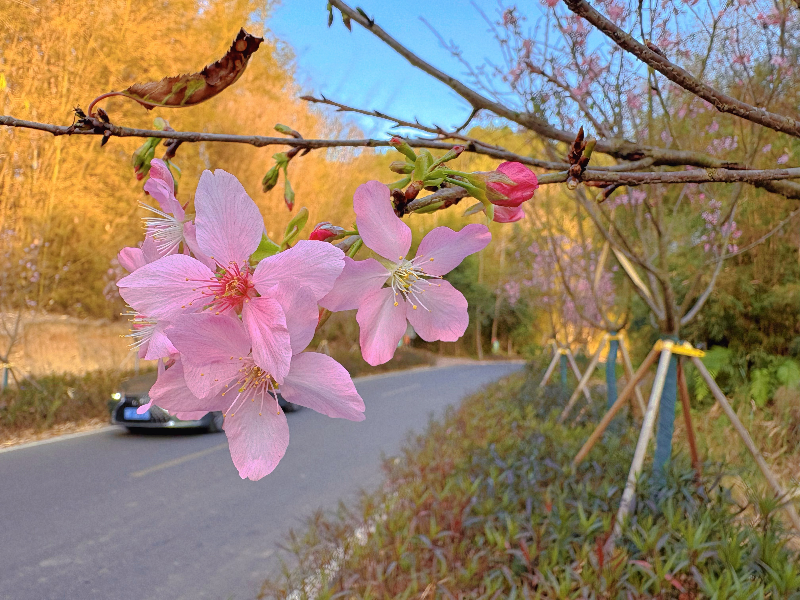 据悉,为贯彻落实省乡村绿化三年行动计划、绿美韶关生态建设目标任务以及始兴县乡村绿化工作部署,2025年沈所镇选取了沈北村以及沈南村联合打造绿美乡村示范带项目。在X395线兴隆桥头到沈江公路桥段、沈江公路和X344线三岔路到红围段种植樱花1163株,搭配种植灌木三角梅2000余株、翠芦莉和满天星5250平方米,勾勒出视觉层次丰富的绿地空间。目前正在盛开的是广州樱品种,其余樱花品种将陆续在三月底前开花,观赏期能持续一个月。