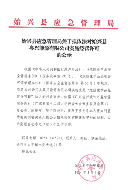 始兴县应急管理局关于拟依法对始兴县粤兴能源有限公司经营许可的公示