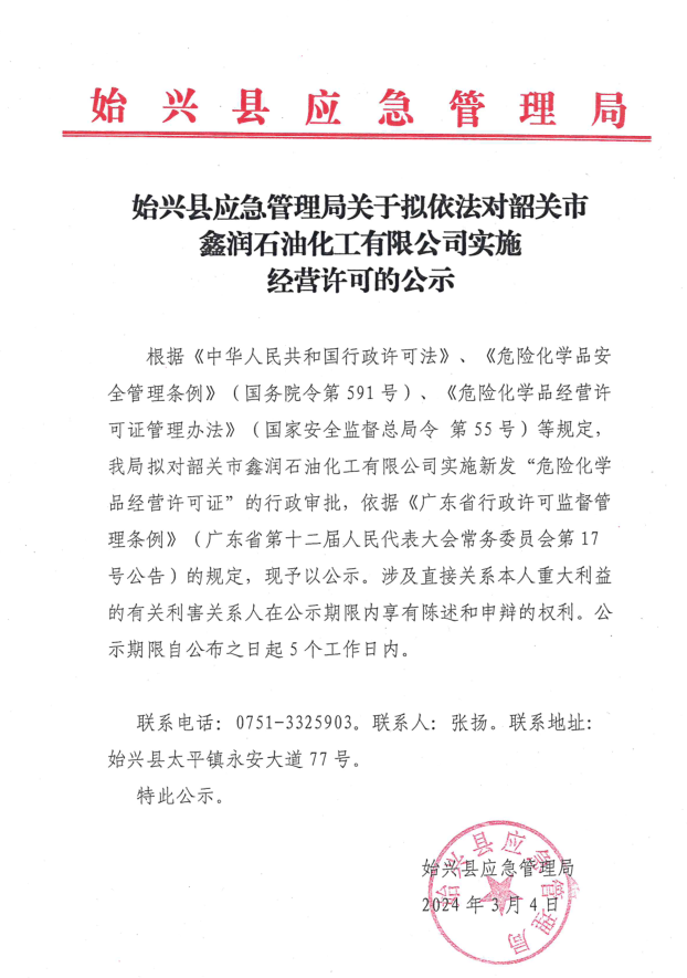 始兴县应急管理局关于拟依法对韶关市鑫润石油化工有限公司经营许可的公示