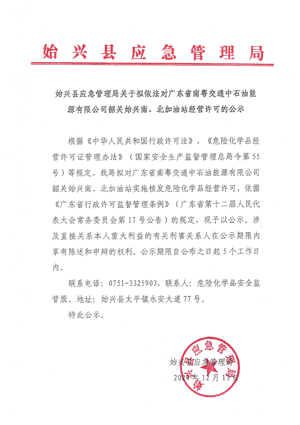 始兴县应急管理局关于拟依法对广东省南粤交通中石油能源有限公司韶关始兴南、北加油站经营许可的公示
