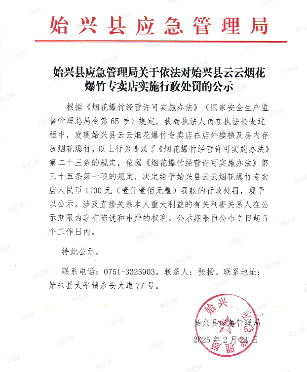 始兴县应急管理局关于依法对始兴县云云烟花爆竹专卖店实施行政处罚的公示