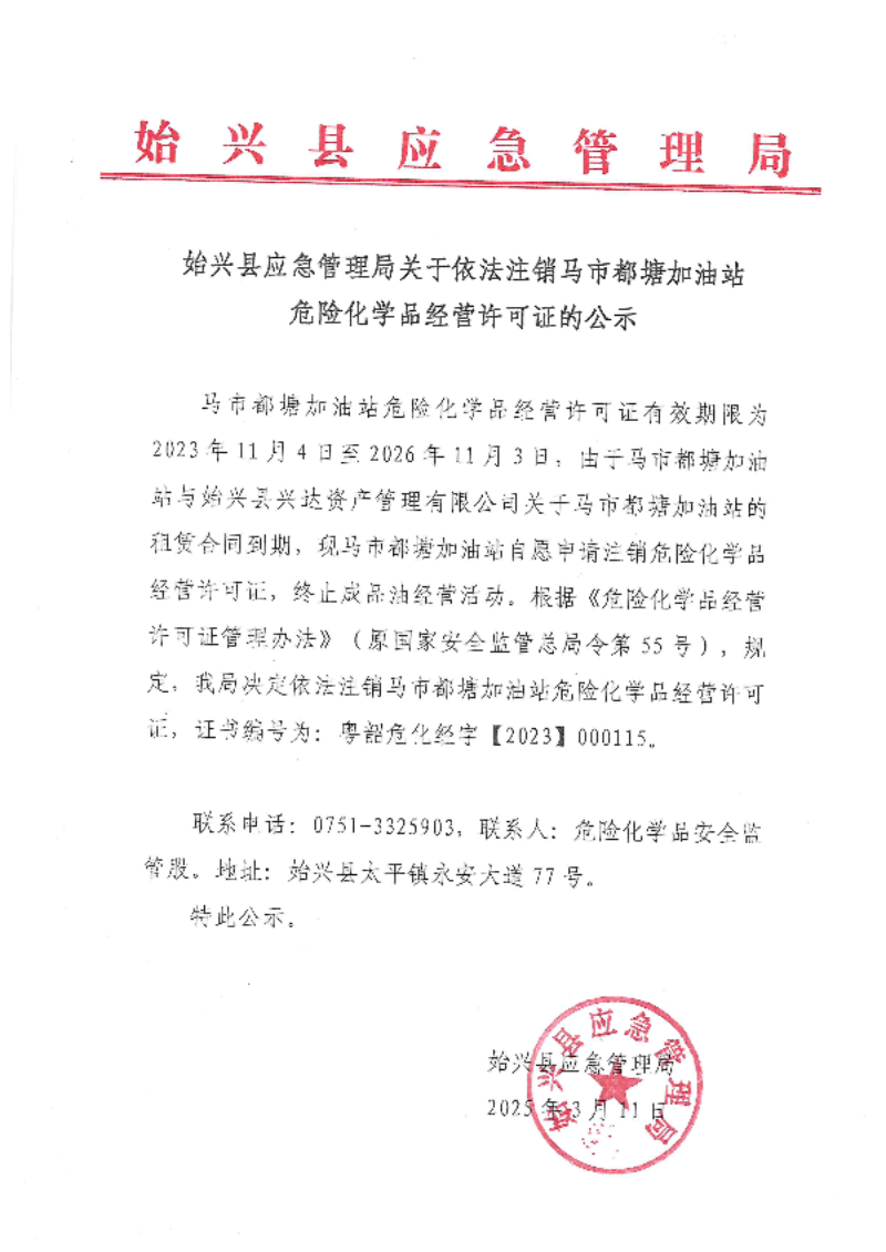 始兴县应急管理局关于依法注销马市都塘加油站危险化学品经营许可证的公示