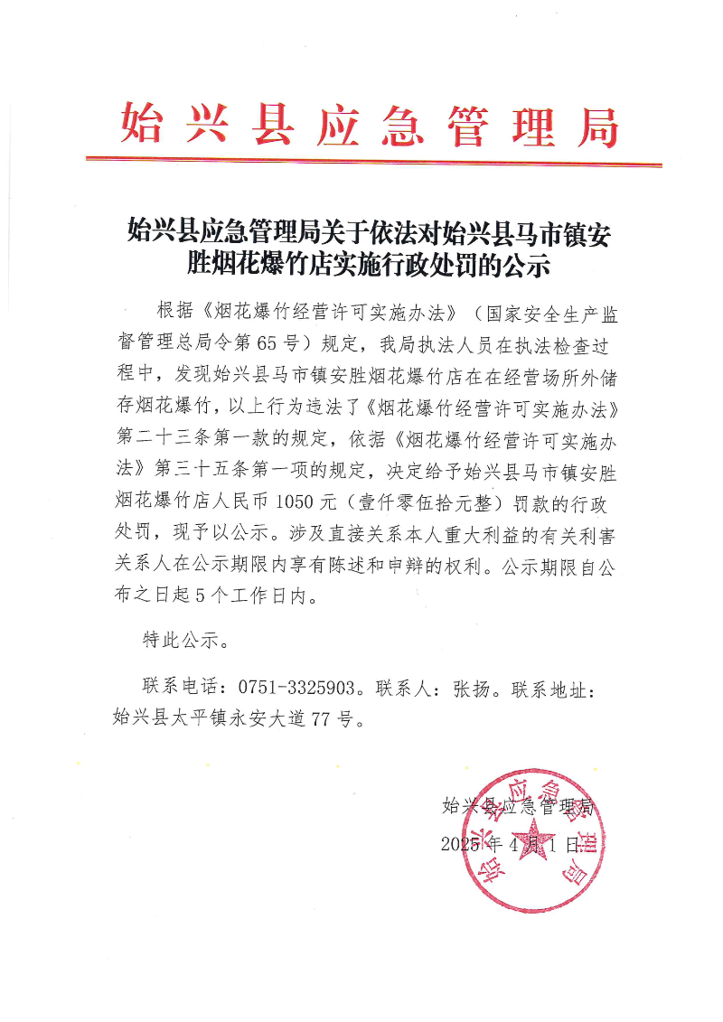 始兴县应急管理局关于依法对始兴县马市镇安胜烟花爆竹店实施行政处罚的公示