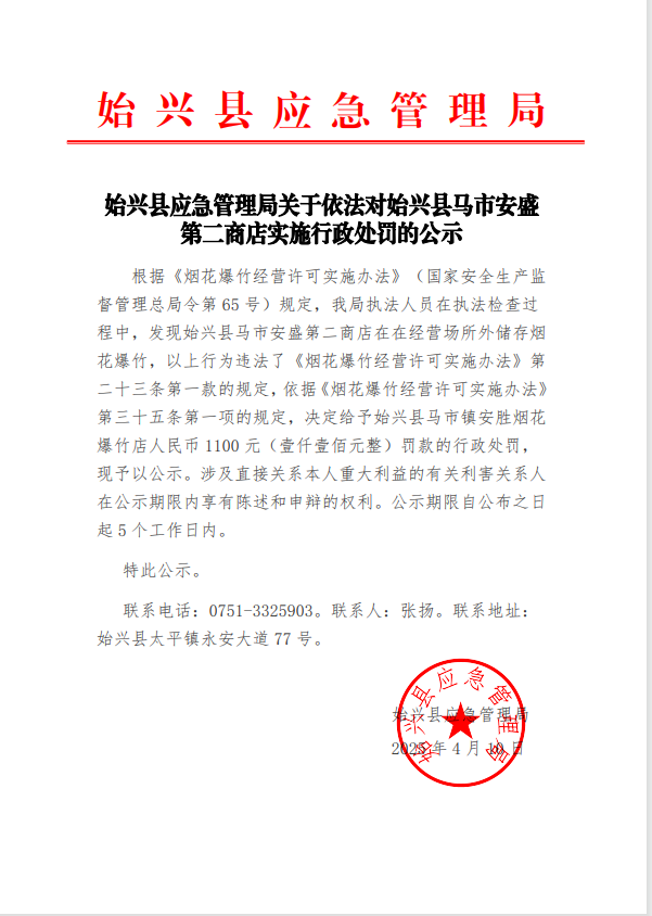 始兴县应急管理局关于依法对始兴县马市安盛第二商店实施行政处罚的公示