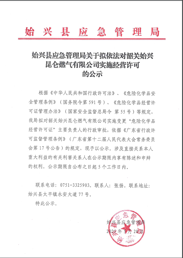 始兴县应急管理局关于拟依法对韶关始兴昆仑燃气有限公司实施经营许可的公示