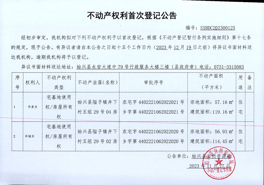 不动产权利首次登记公告