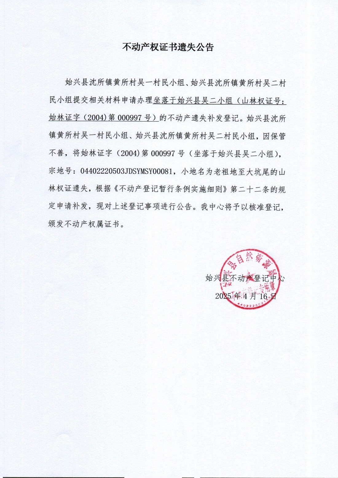 不动产权证书遗失公告(始兴县沈所镇黄所村吴一、吴二小组)