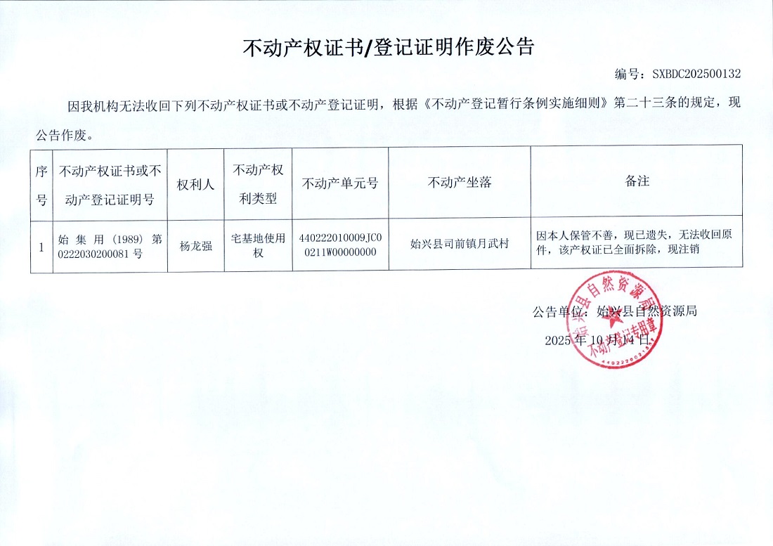 不动产权证书/登记证明作废公告(杨龙强)