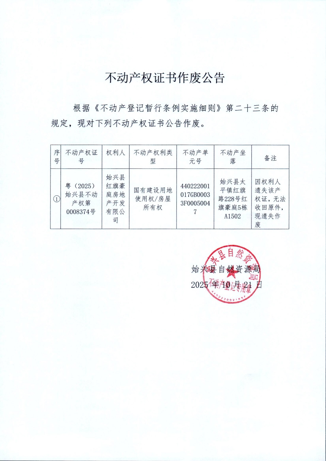 不动产权证书作废公告(始兴县红旗豪庭房地产开发有限公司)