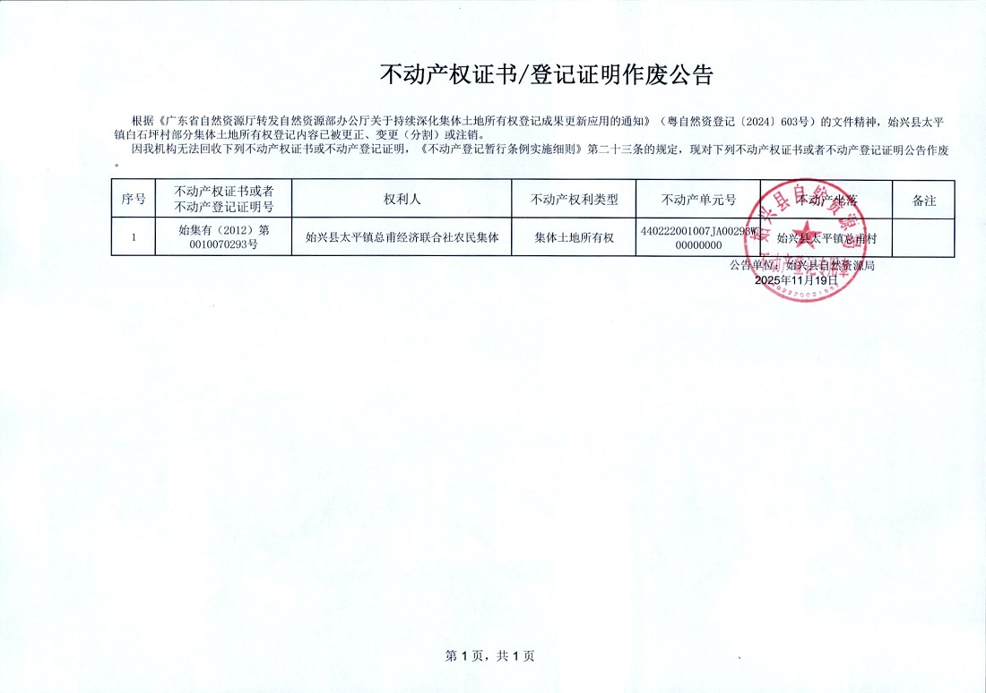 不动产权证书作废公告(始兴县太平镇总甫经济联合社农民集体)