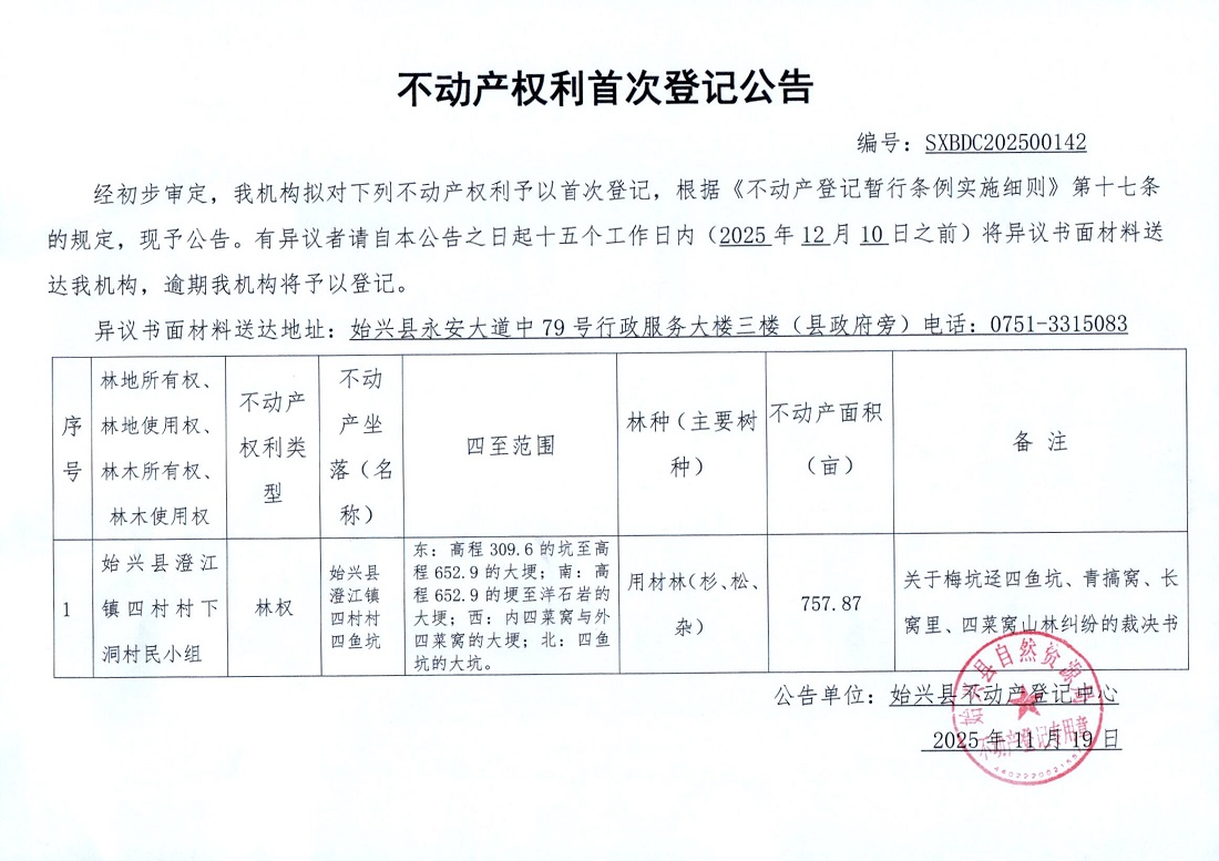 不动产权利首次登记公告(始兴县澄江镇四村村四鱼坑)