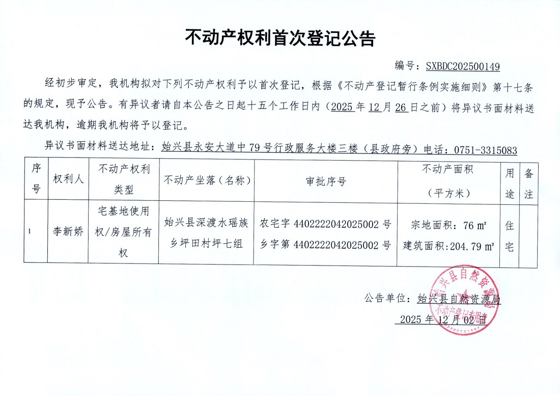 不动产权利首次登记公告(李新桥)