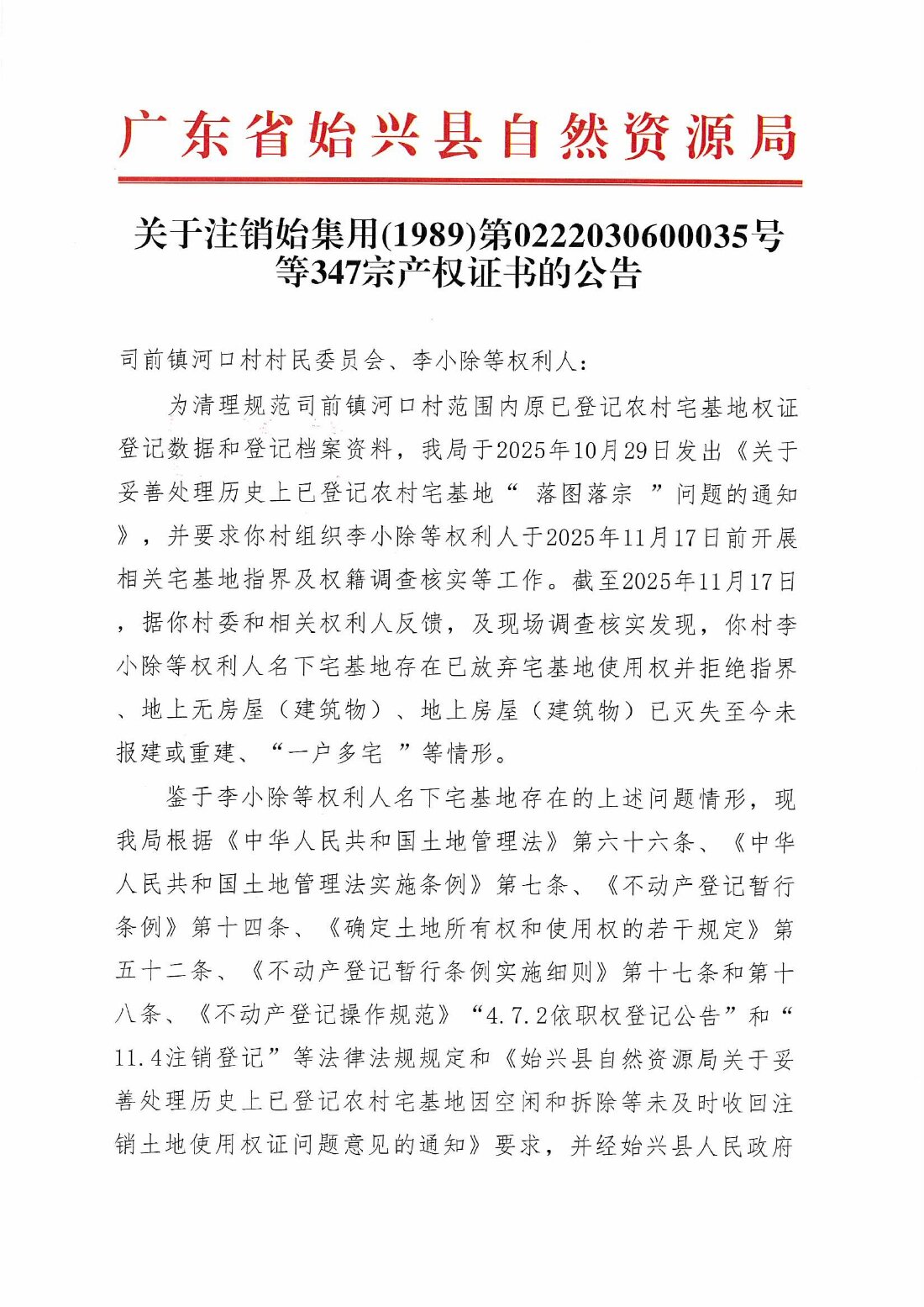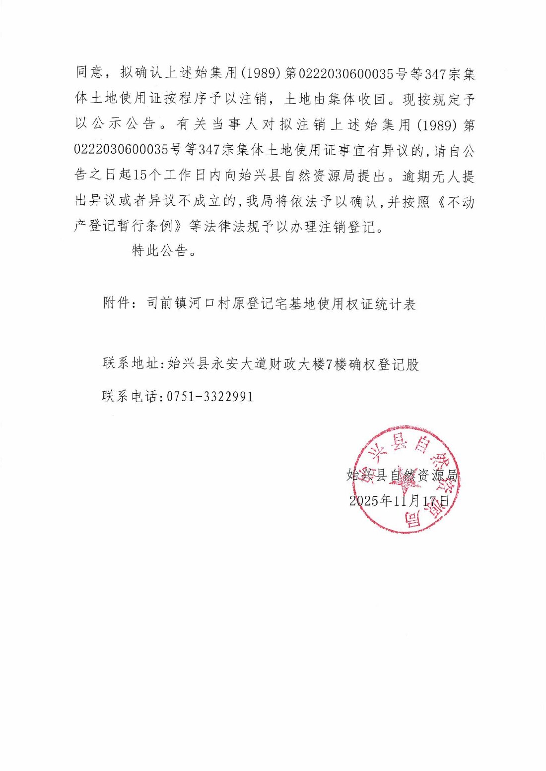 关于注销始集用(1989)第0222030600035号等347宗产权证书的公告