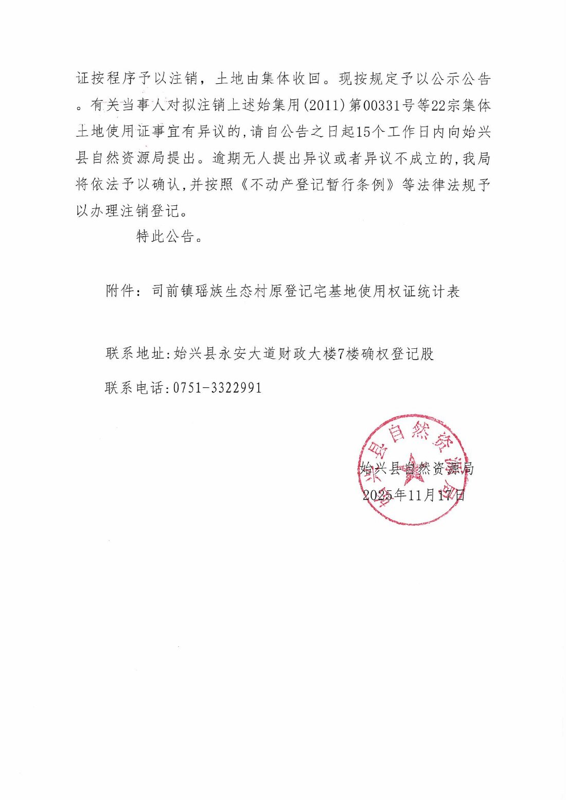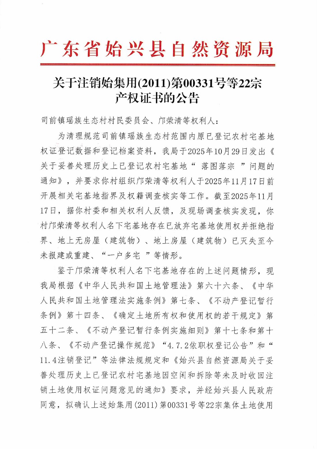 关于注销始集用(2011)第00331号等22宗产权证书的公告