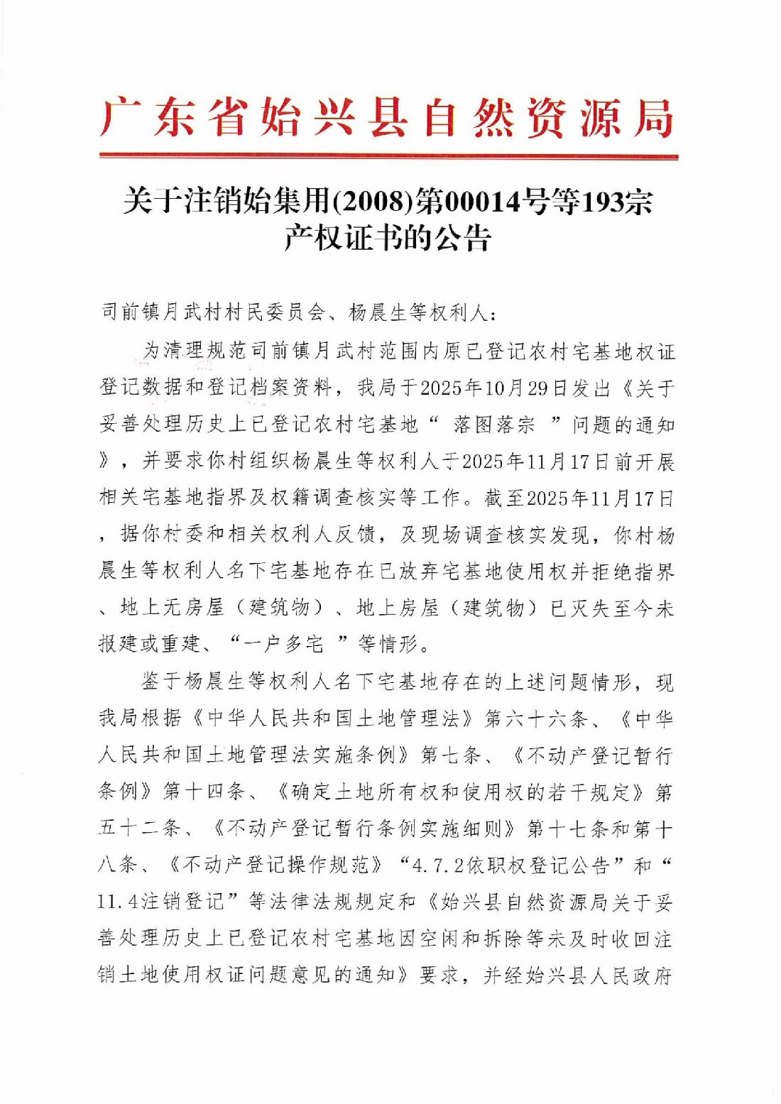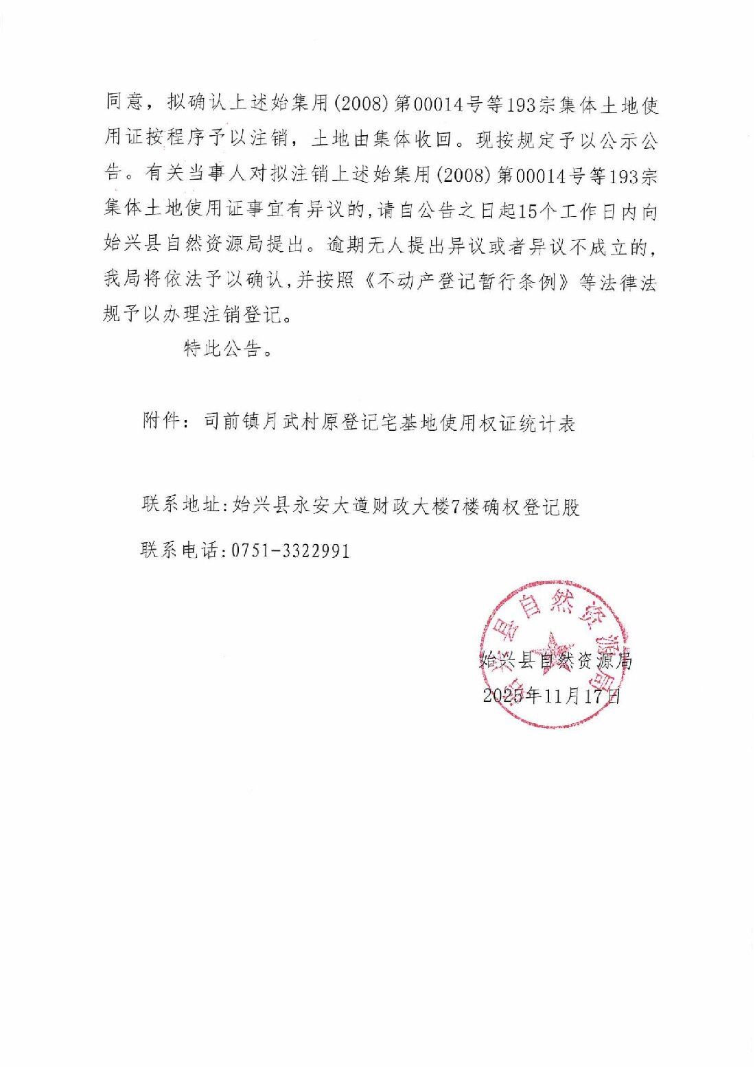 关于注销始集用(2008)第00014号等193宗产权证书的公告