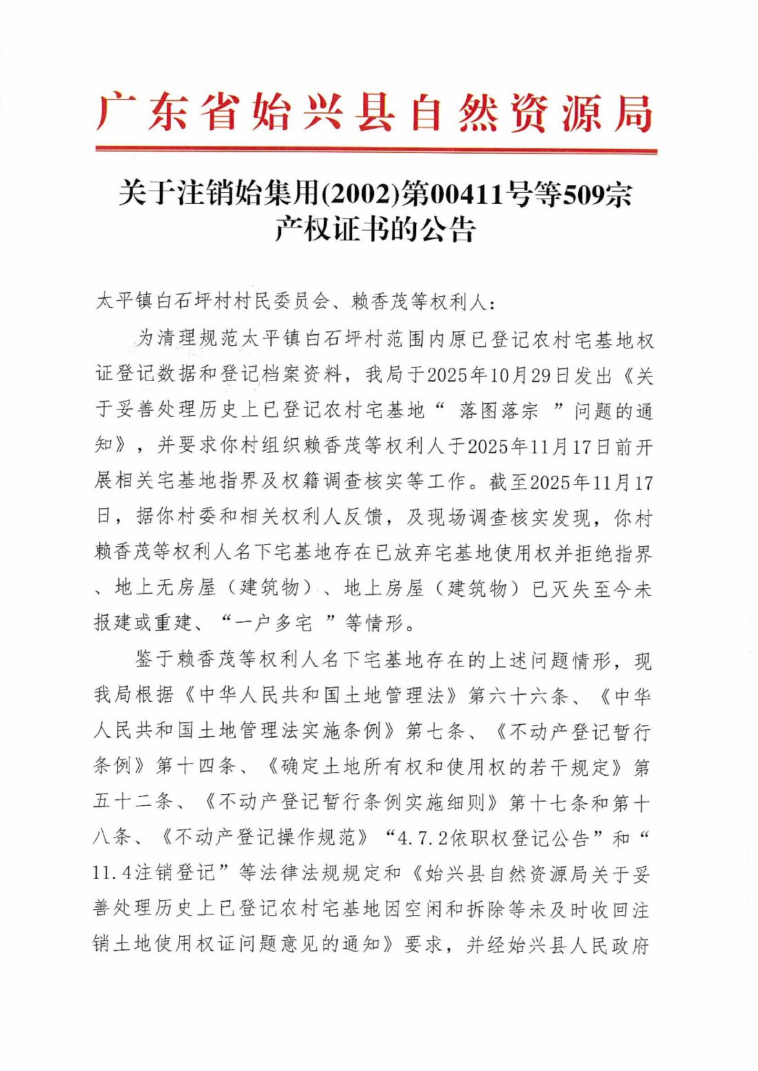 关于注销始集用(2002)第00411号等509宗产权证书的公告