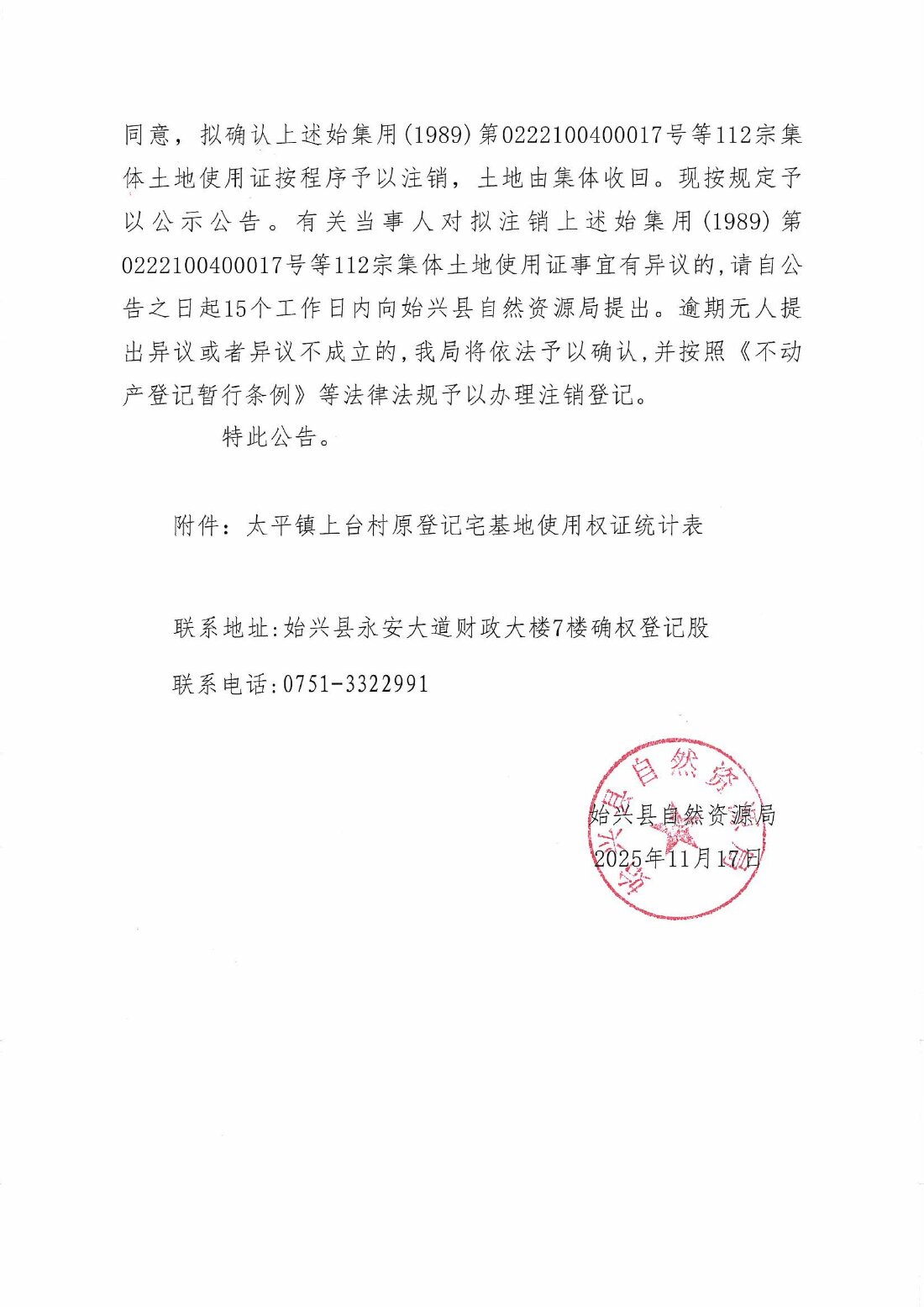 关于注销始集用(1989)第0222100400017号等112宗产权证书的公告