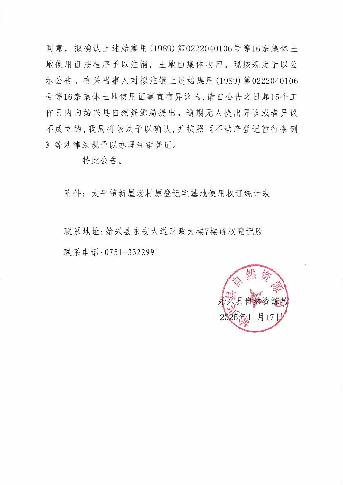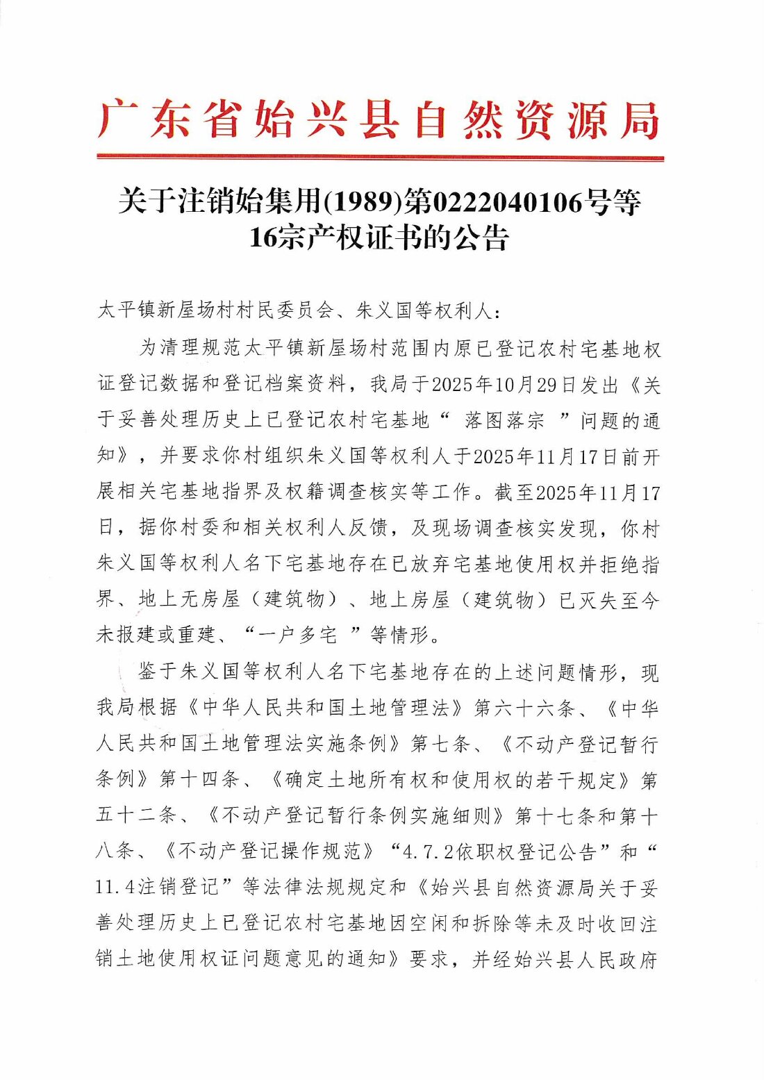 关于注销始集用(1989)第0222040106号等16宗产权证书的公告