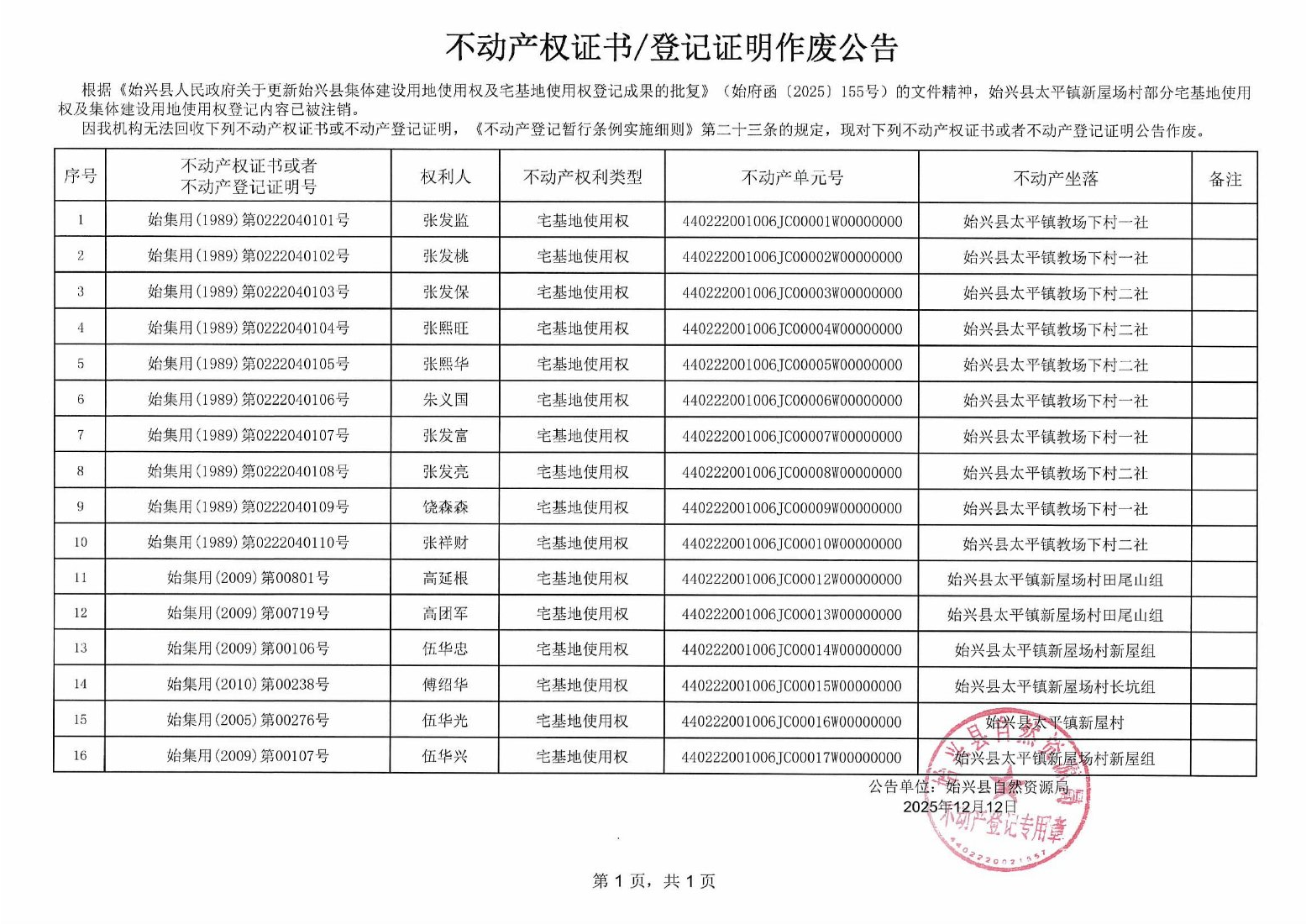 不动产权证书/登记证明作废公告(太平镇新屋场村)