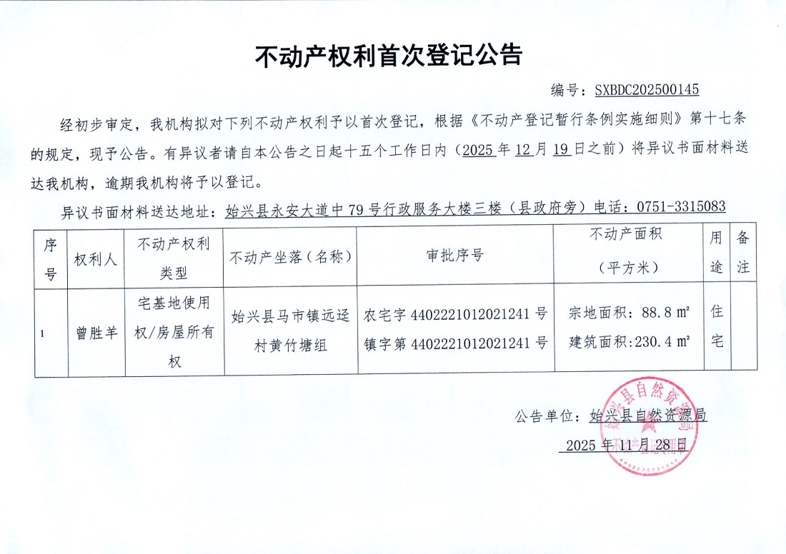 不动产权利首次登记公告(曾胜羊)