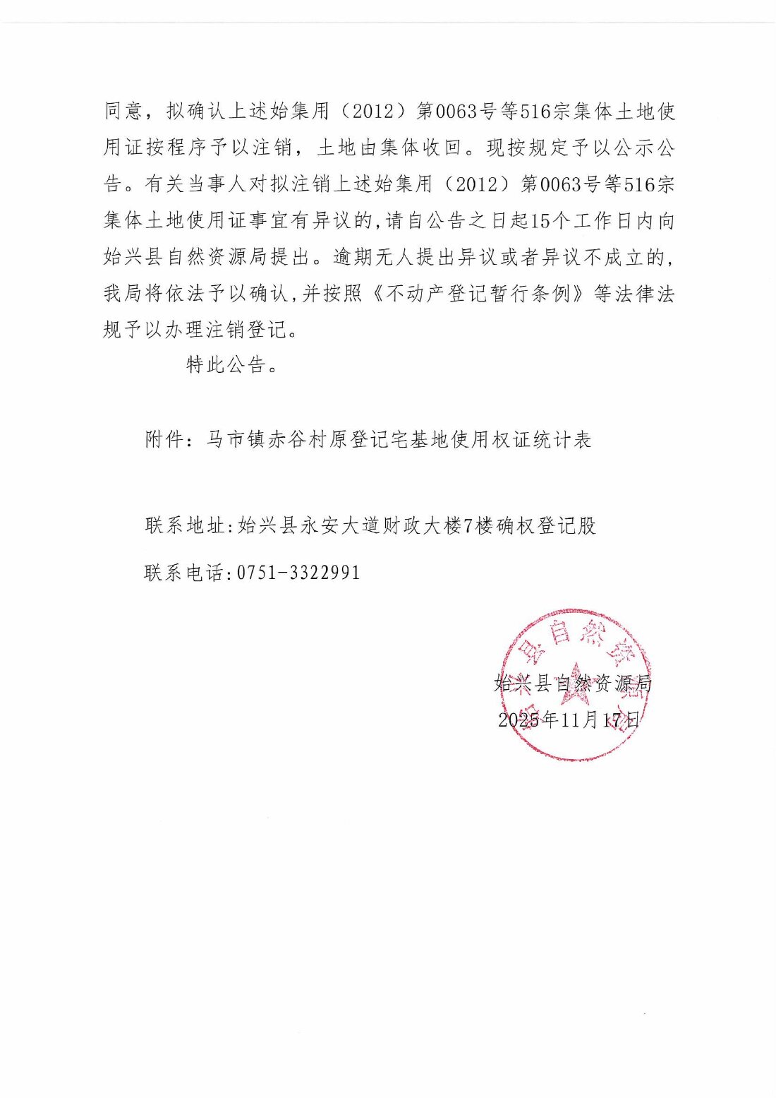 关于注销始集用(2012)第0063号等516宗产权证书的公告