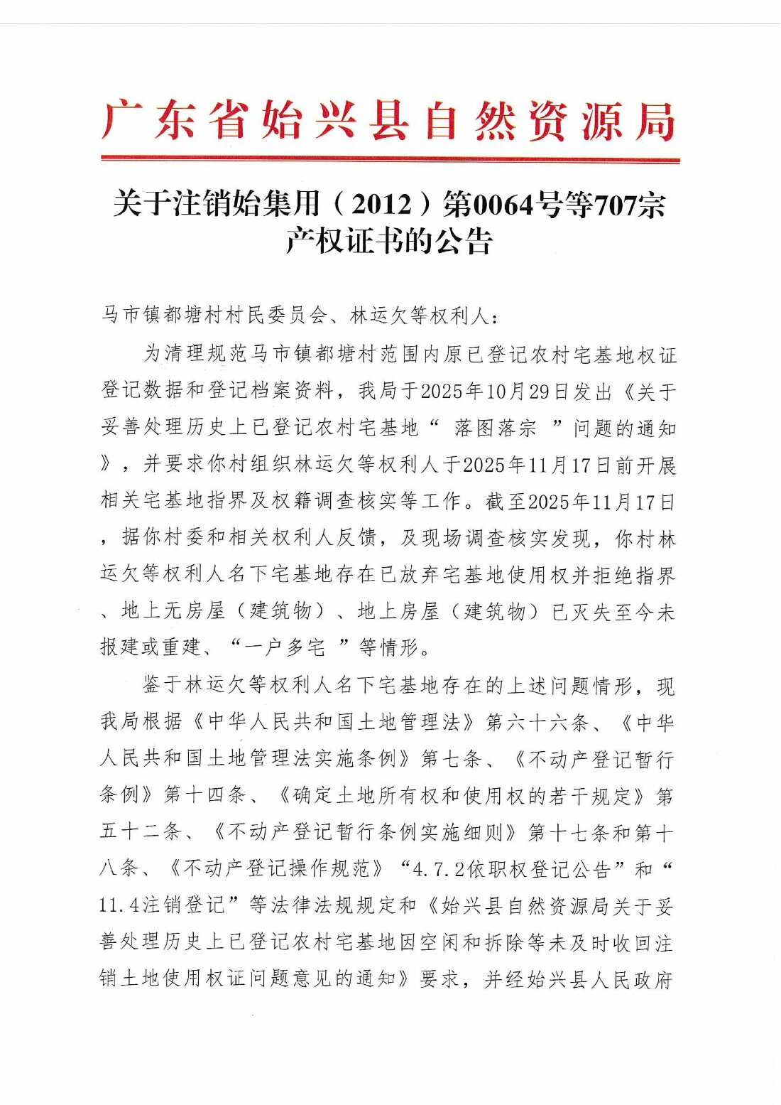 关于注销始集用(2012)第0064号等707宗产权证书的公告