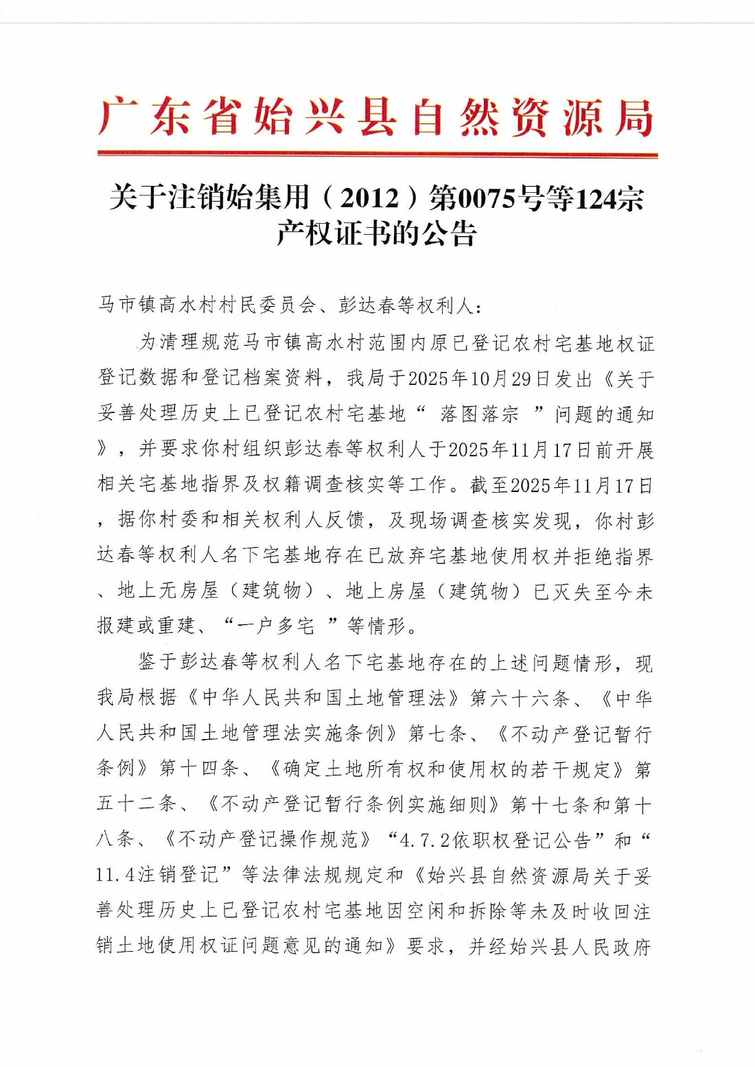 关于注销始集用(2012)第0075号等124宗产权证书的公告