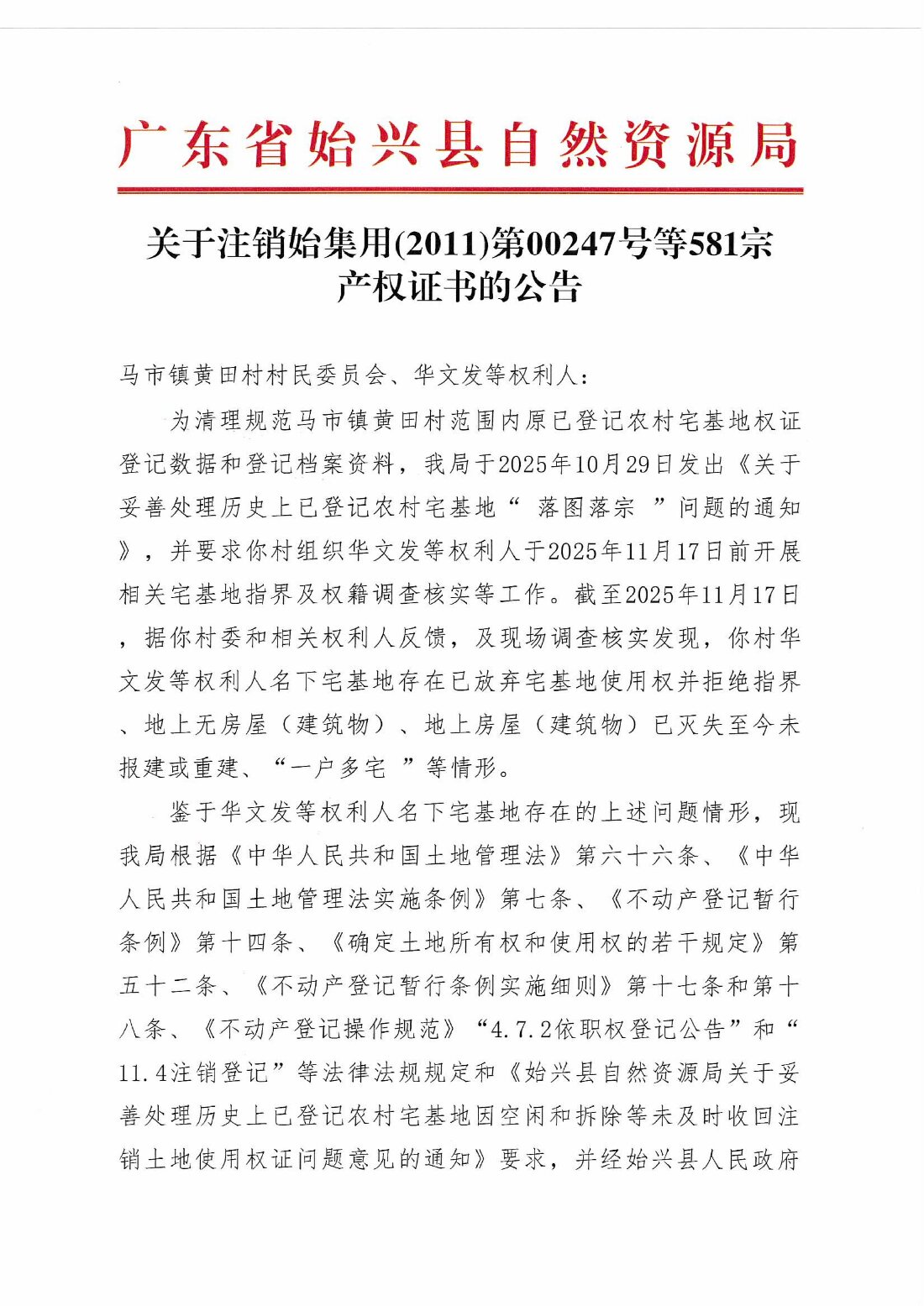 关于注销始集用(2011)第00247号等581宗产权证书的公告