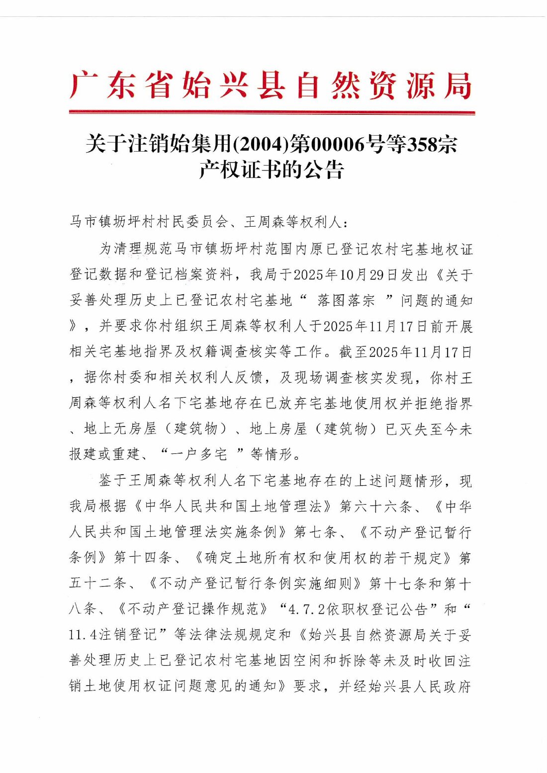 关于注销始集用(2004)第00006号等358宗产权证书的公告