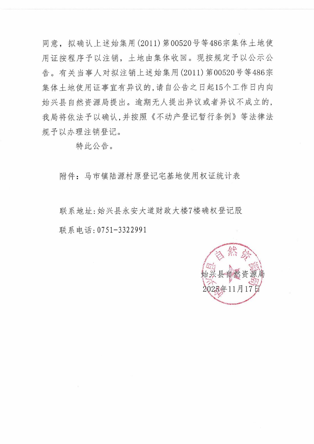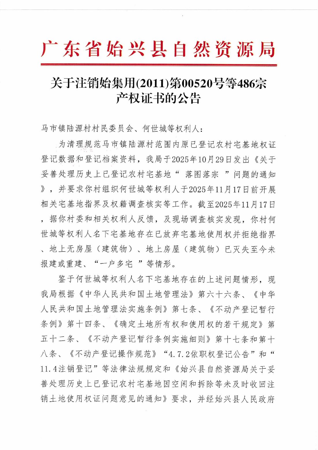 关于注销始集用(2011)第00520号等486宗产权证书的公告