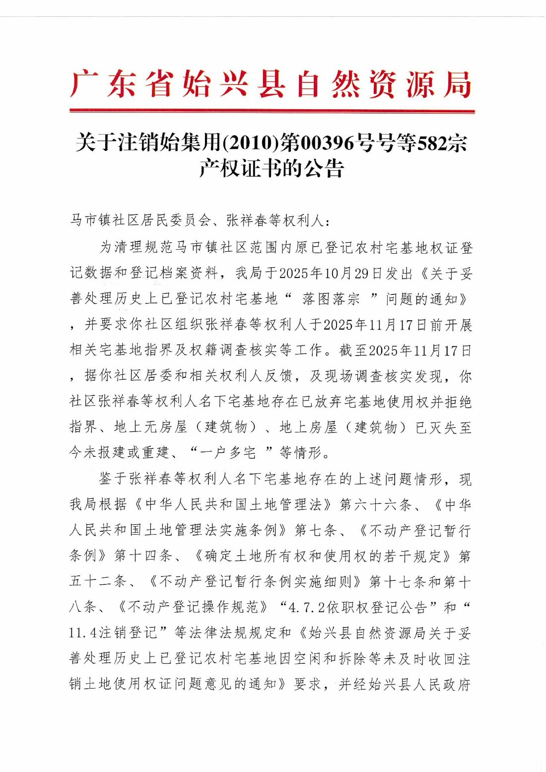关于注销始集用(2010)第00396号等582宗产权证书的公告