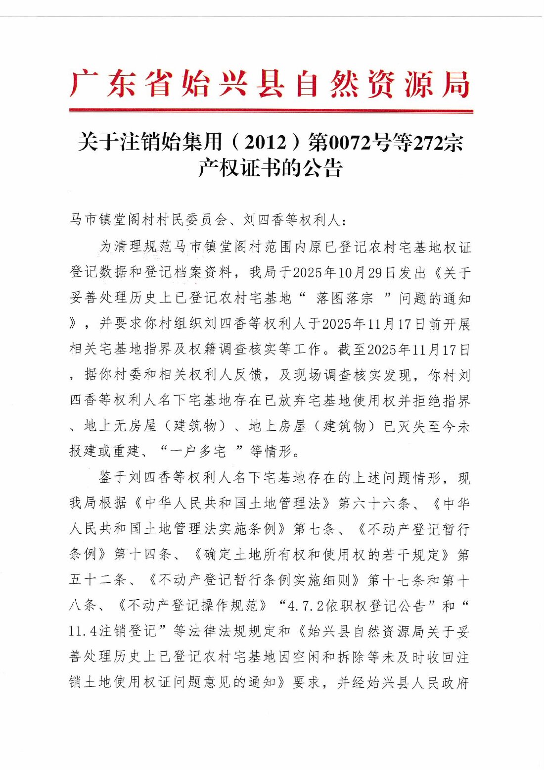 关于注销始集用(2012)第0072号等272宗产权证书的公告
