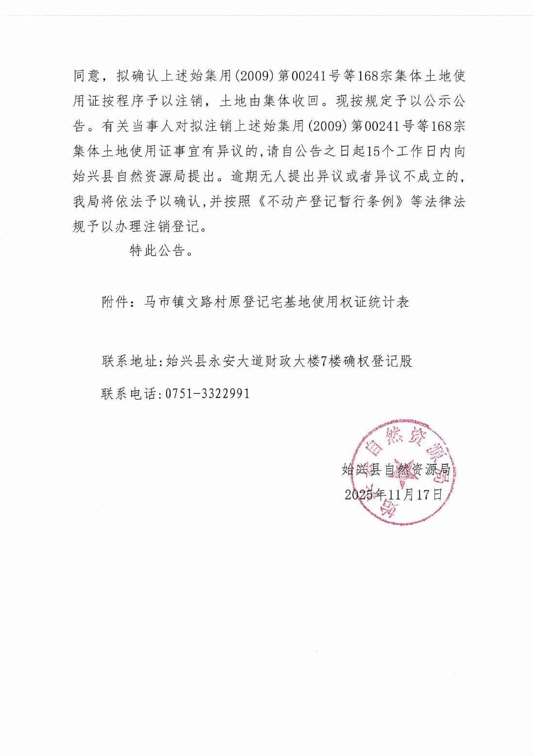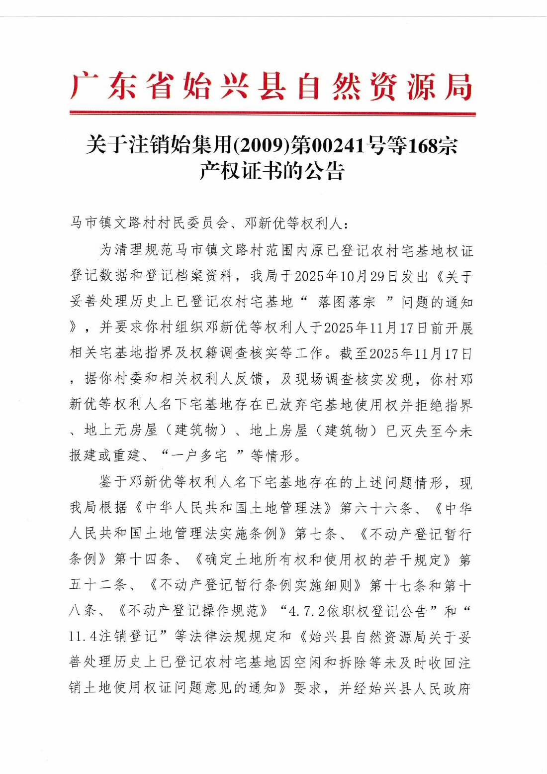 关于注销始集用(2009)第00241号等168宗产权证书的公告