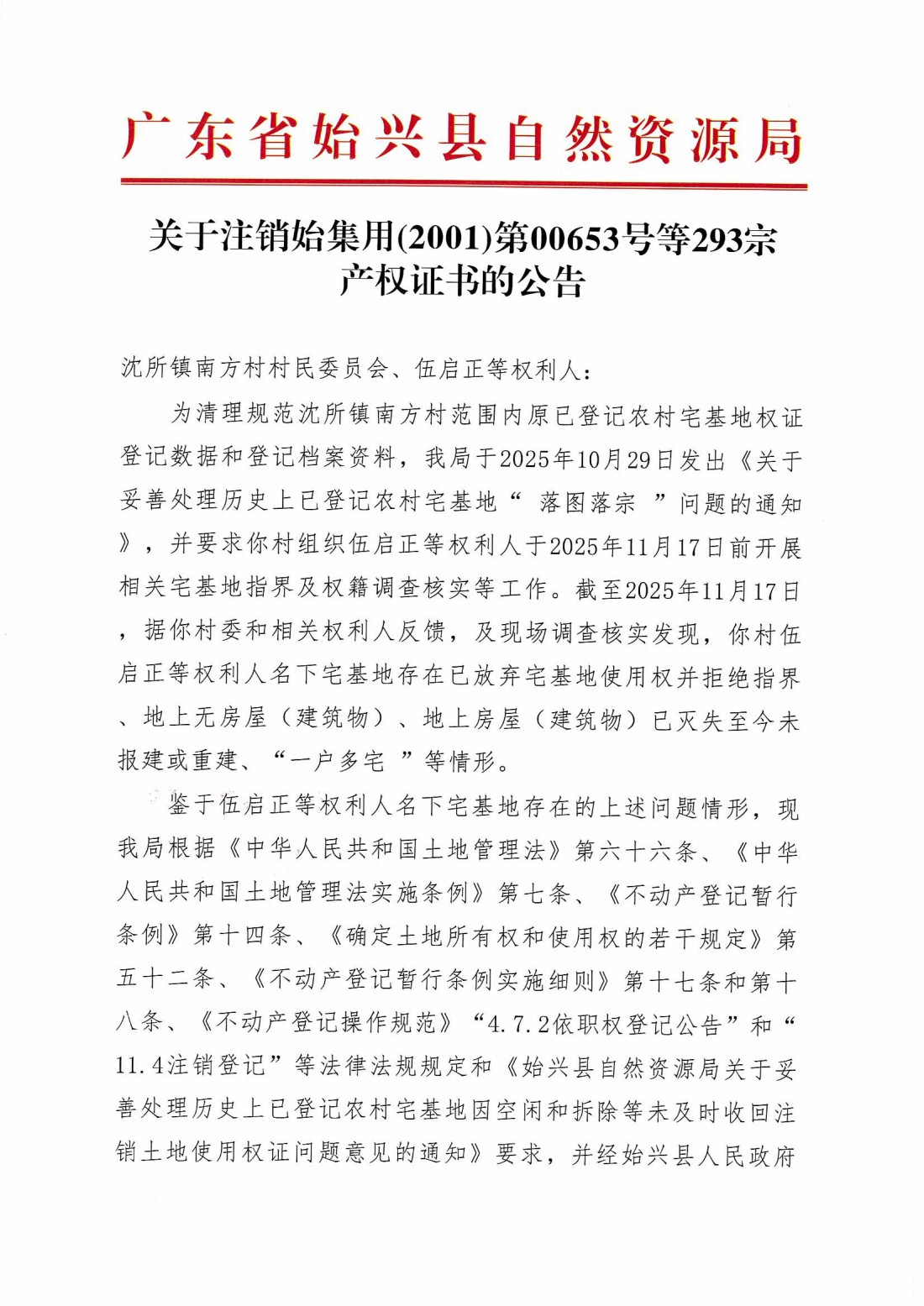 关于注销始集用(2001)第00653号等293宗产权证书的公告