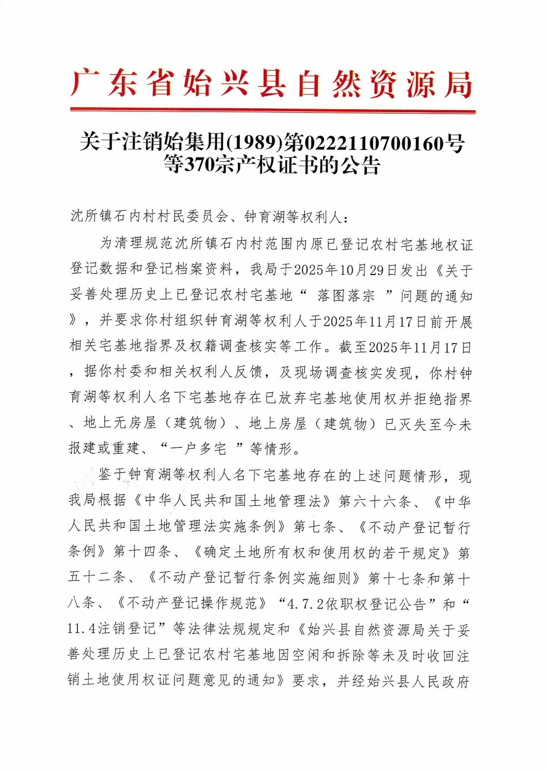 关于注销始集用(1989)第0222110700160号等370宗产权证书的公告