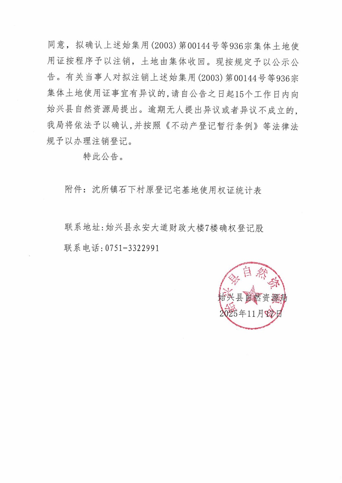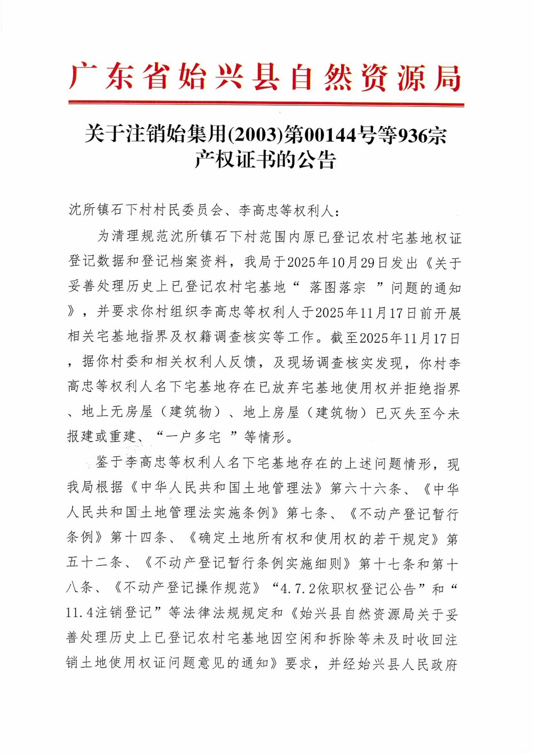 关于注销始集用(2003)第00144号等936宗产权证书的公告
