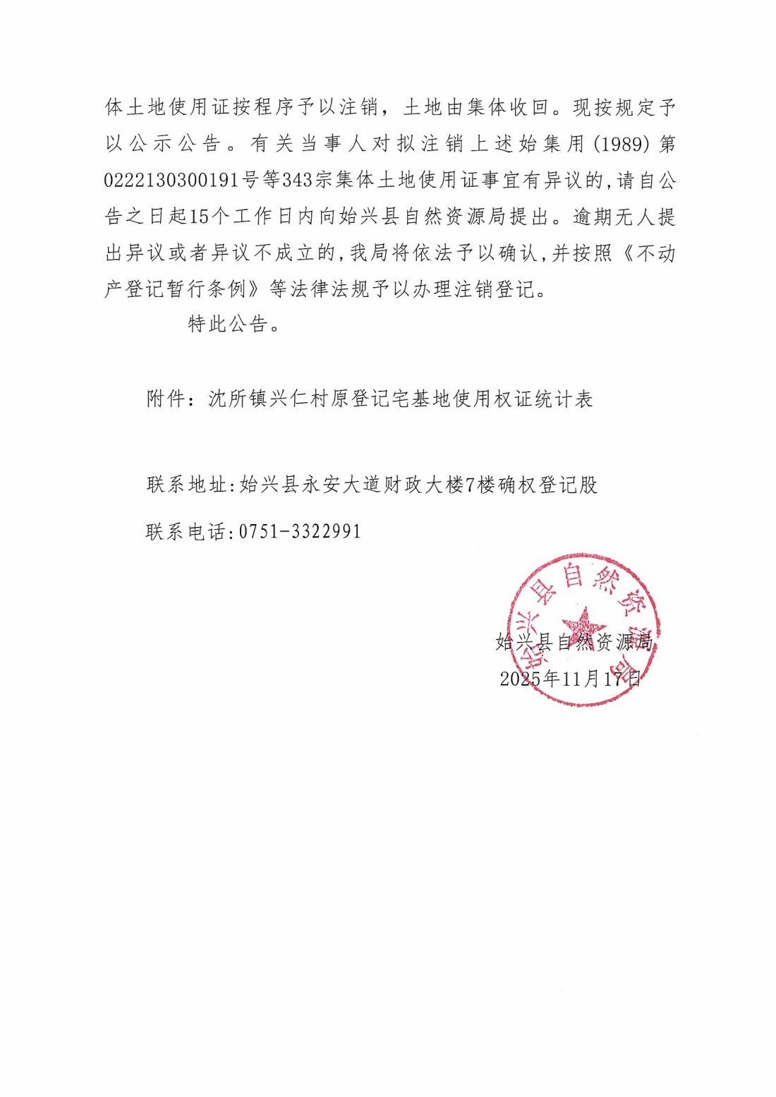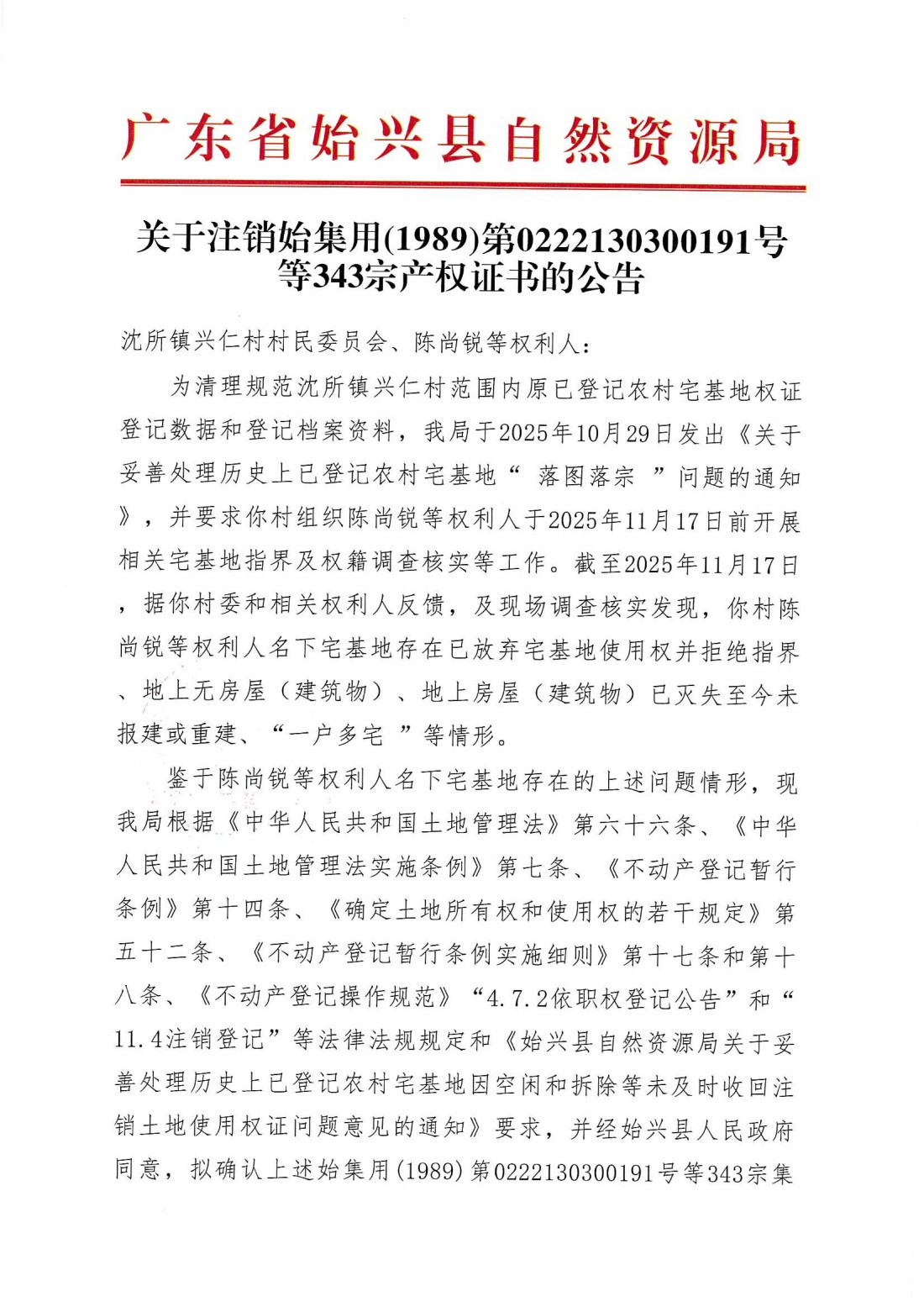 关于注销始集用(1989)第0222130300191号等343宗产权证书的公告