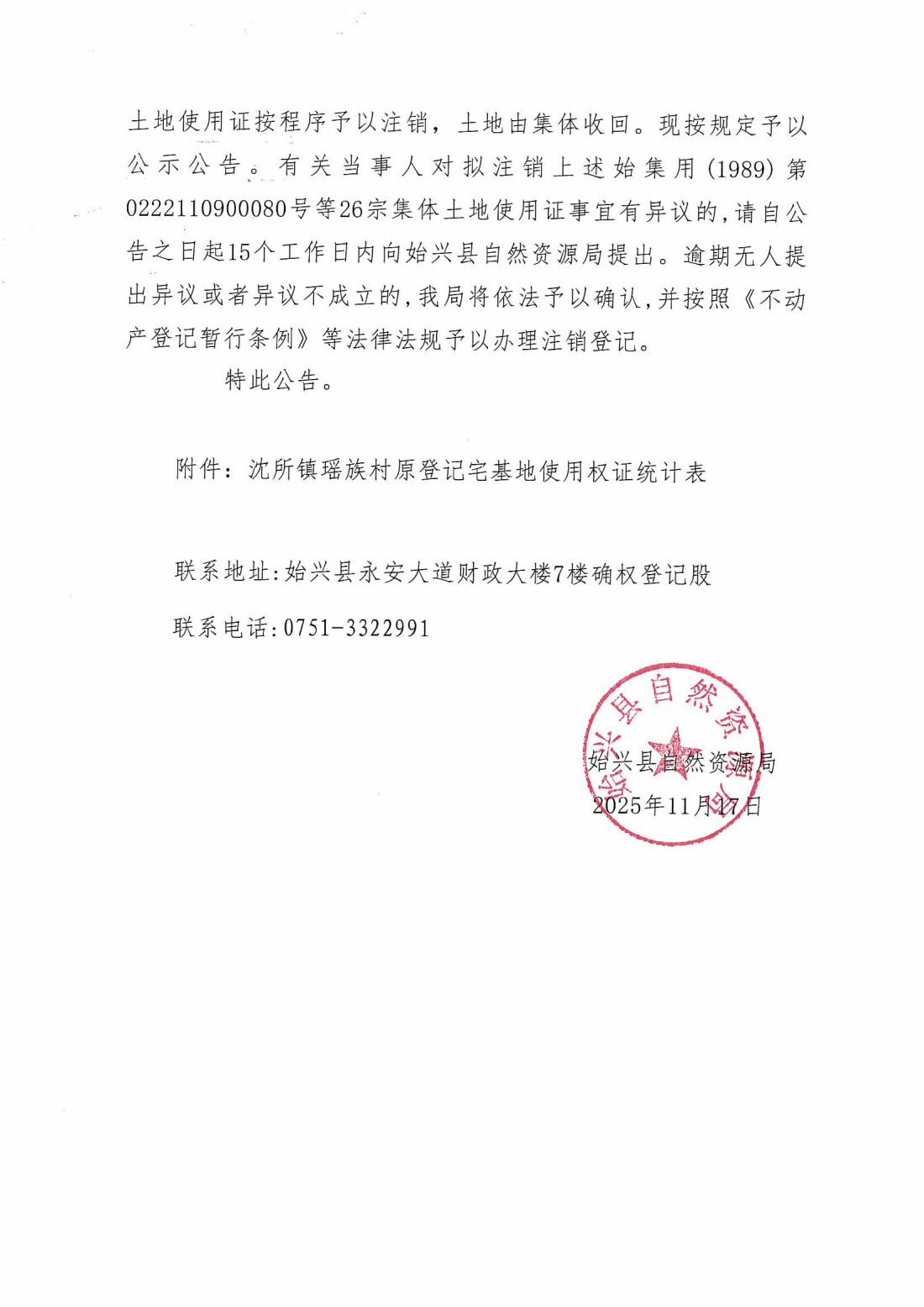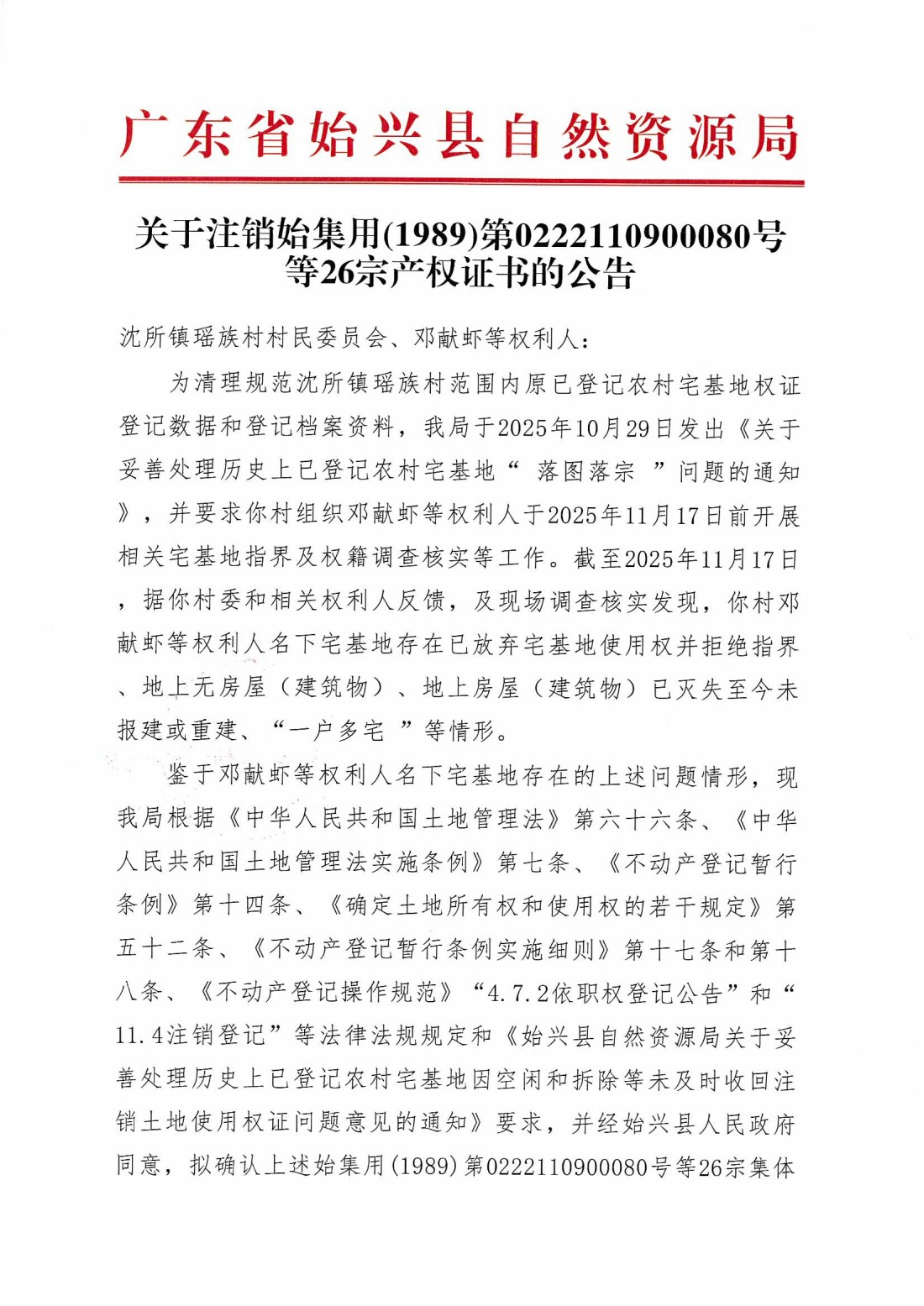关于注销始集用(1989)第0222110900080号等26宗产权证书的公告